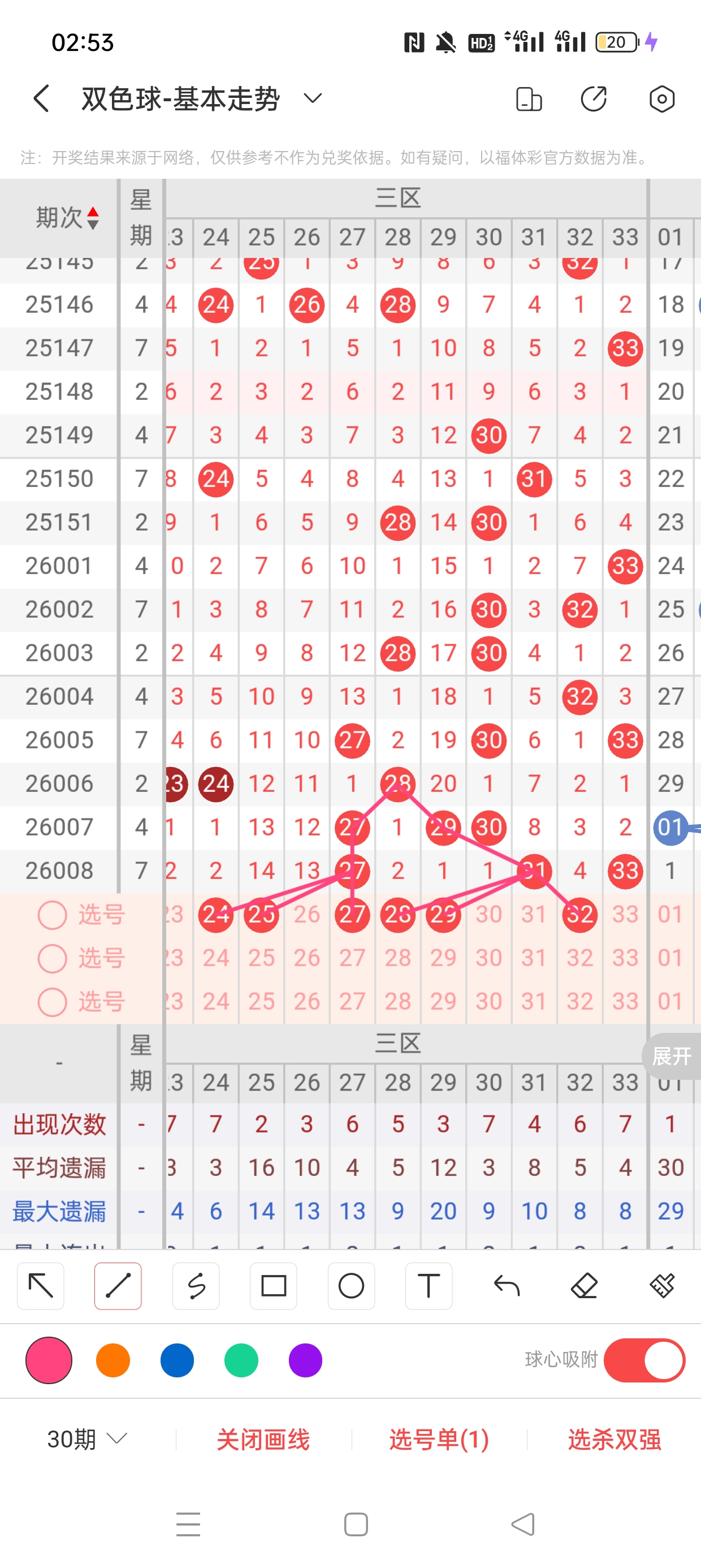 三区(23-33)近13期本区邻孤传6邻7孤0传,孤号热度高,本期着重邻传。近13期本区012路8:0:5,0/2路热度高,本着重1路。24、25分别遗漏2期、14期,两者与27之间呈现向左遗漏递减态势,需防。27作为传号,呈现直落回补态势,需防。28、29分别遗漏2期、1期,两者与31之间呈现向左遗漏递减态势,需防。32已遗漏4期,与31之间呈现向右遗漏递减态势,需防。