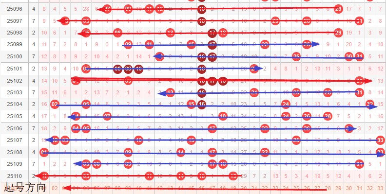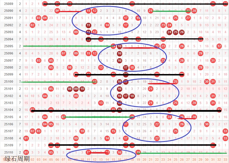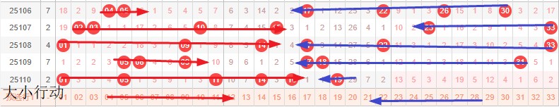 如图所示:体现的是3个局部走势的发展周期,圆圈为密集处的填空,本期定性为新局部走势3期,修饰真实目的框架,主力填空第1期,定性本周期蛋跨为18-28,真实空间为19-33,本期多号填19-33空间,放大11-14空间,体现大号多。