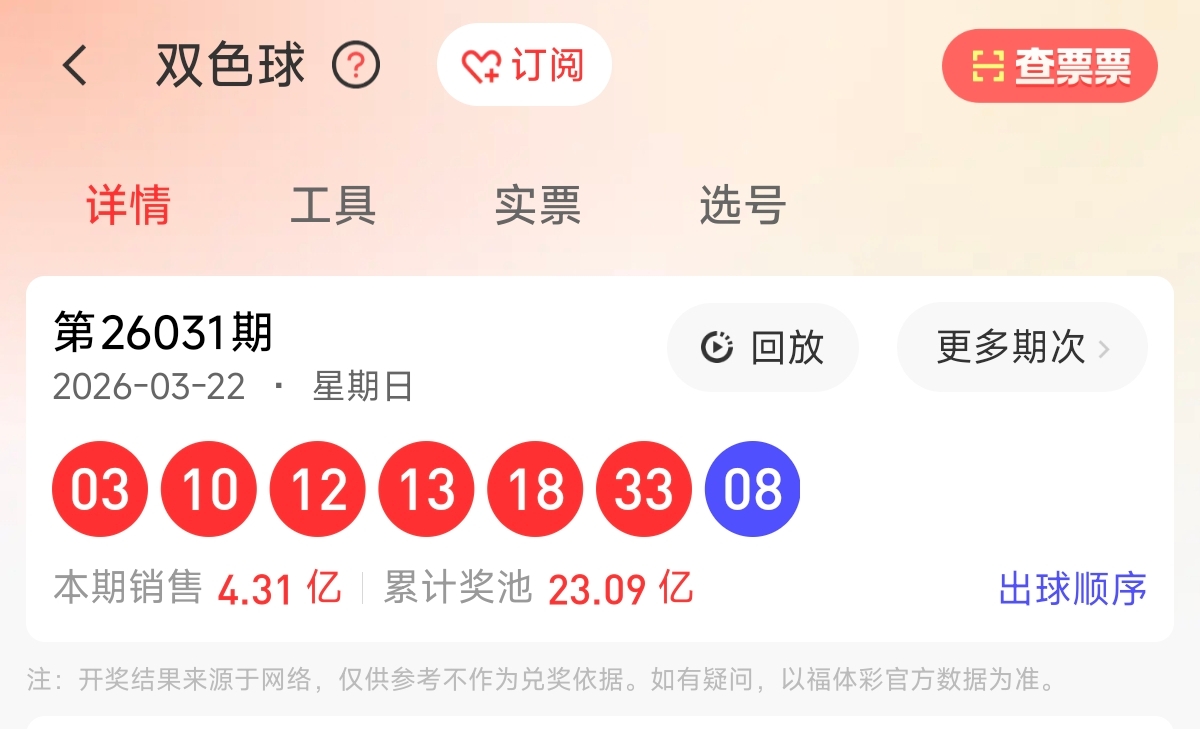 首先让我们回顾一下上期双色球26031期的开奖号码为03、10、12、13、18、33,蓝球08。和值89,跨度30,区间比为2:3:1,奇偶比为3:3。