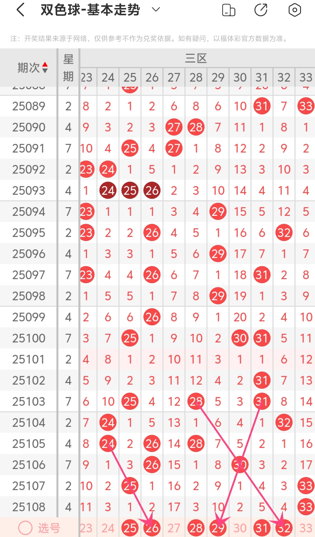 上期第三区间开出33,本期我们可以从上面走势图中看到选号的思路,26为斜连走势,29为斜连走势,32为斜连走势,综合以上分析本期第三区间推荐25 26 28 29 31 32