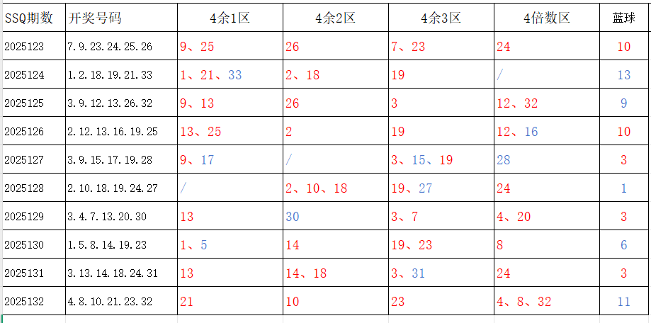 首先看上期回顾,双色球2025132期开奖结果:4.8.10.21.23.32+11。其中红球号码开出:4余1区号码1个,4余2区号码1个,4余3区号码1个,4倍数区号码3个。蓝球号码:冷号回补。再看上期个人分析:胆尾中出4尾4码!恭喜中出的虹友!