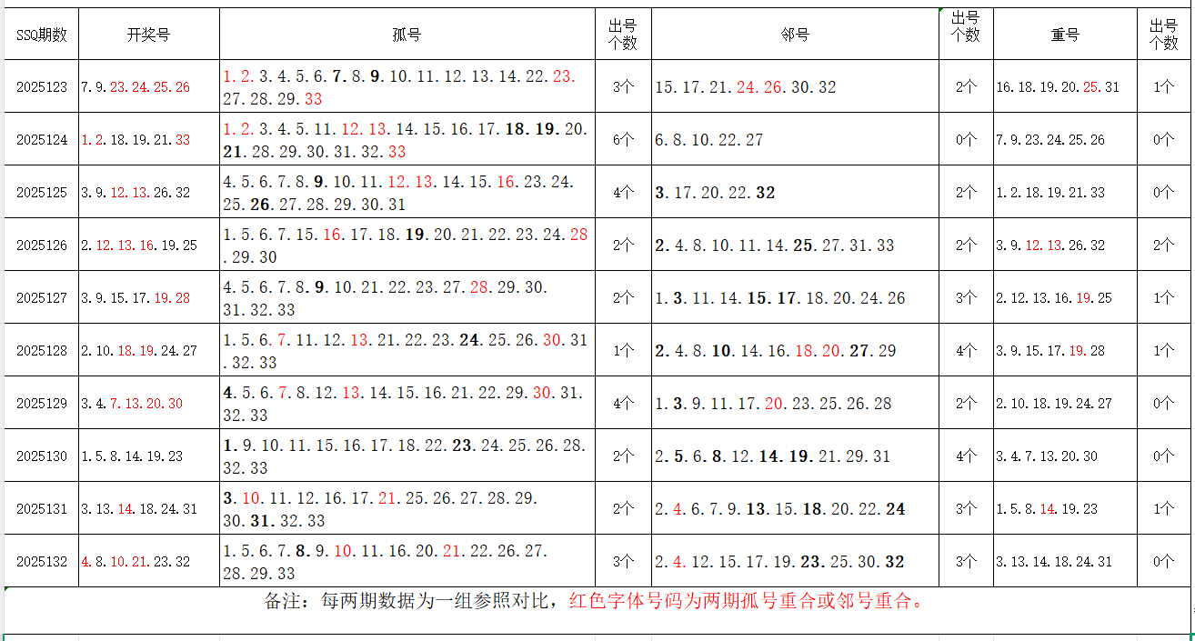如图,以近两期数据为一组,进行对比分析。相同的孤号、邻号,可能在下期出1-4个左右。上期开出孤号3个,邻号3个,重号0个。本期参考孤号:1.2.6.12.13.14.15.16.17.18.19.25.26.27.28.29.30;邻号:3.5.7.9.11.20.22.24.31.33;孤、邻号重合号码精选:***(会员专区可见)。个人分析,仅供参考。