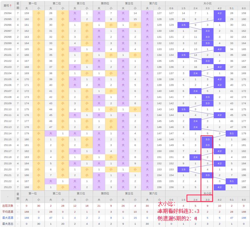 上期大小比:4:2,近10期大小比出现情况:5:1、3:3、3:3、4:2、2:4、4:2、1:5、3:3、5:1、4:2,最近10期出现3期3:3,出现3期4:2,出1期2:4,出现2期5:1,出现1期1:5,出现0期6:0,出现0期0:6,根据近10期规律本期看好斜连的3:3,防遗漏5期开出3:3,综上所述推荐大小比推荐:2:4,重点关注:3:3。
