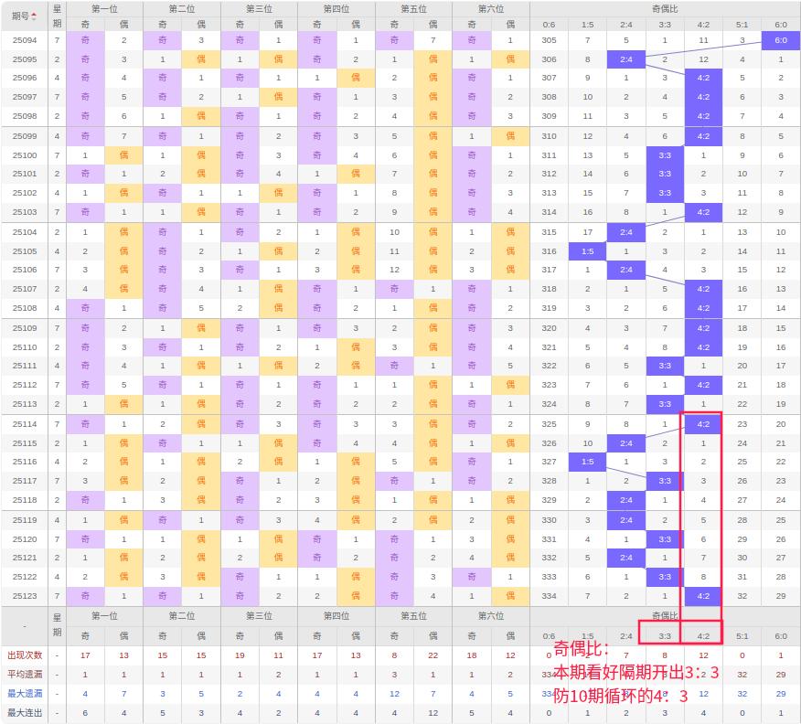 上期奇偶比:4:2,近10期奇偶比出现情况:4:2、2:4、1:5、3:3、2:4、2:4、3:3、2:4、3:3、4:2,最近10期出现3期3:3,出现2期4:2,出现4期2:4,出现0期5:1,出现1期1:5,出现0期6:0,出现0期0:6,根据近10期规律本期看好隔期开出3:3,防10期循环的4:2,综上所述推荐奇偶比推荐:4:2,重点关注:3:3。