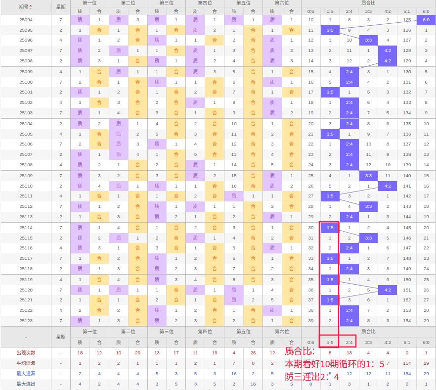 上期质合比:2:4,近10期质合比出现情况:1:5、3:3、2:4、1:5、2:4、1:5、4:2、1:5、2:4、2:4,最近10期出1期3:3,出现1期4:2,出现4期2:4,出现0期5:1,出现4期1:5,出现0期6:0,出现0期0:6,根据近10期规律本期看好10期循环的1:5,防三连出2:4,综上所述推荐质合比推荐:2:4,重点关注:1:5。