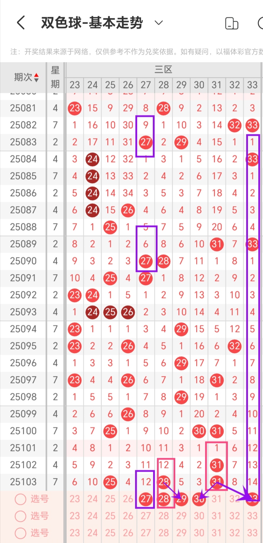 各位兄弟姐妹们大家好,我是nice,我喜欢研究数字的走势规律以及数据分析,通过同期次、同日期、同星期奖号等等出号规律进行杀号和做数据条件,红球杀号的准确率和稳定度都相当不错,首先通过上面的模块进行杀号可以做到杀红球12-15枚,然后将杀号带入到数据条件中进行选胆,这种方法屡试不爽帮助自己排除很多不必要的号码,将红球选号的数量控制在10-12枚,结合红球杀号带入到数据条件中选出的胆码,做胆拖组合控制成本