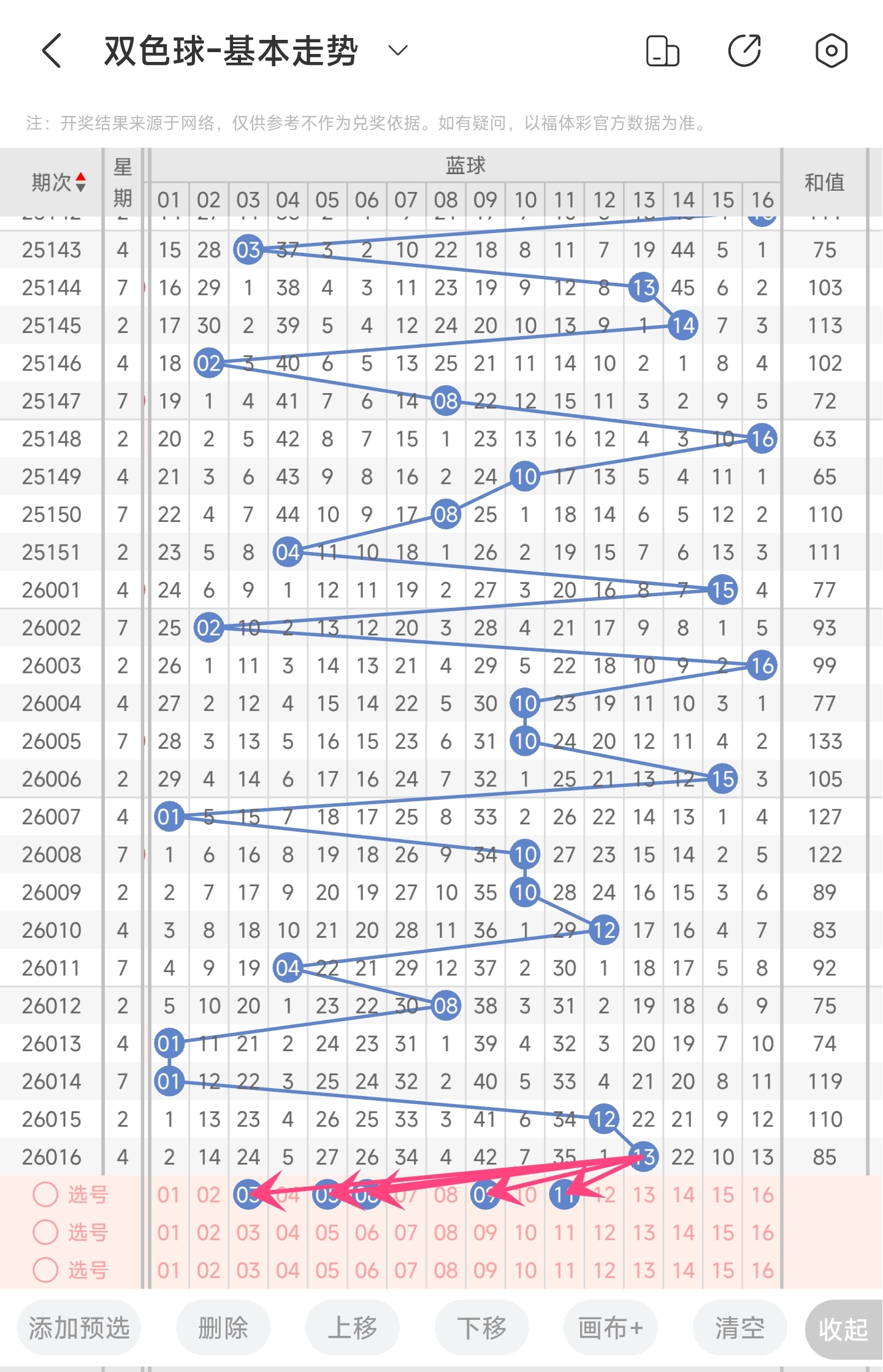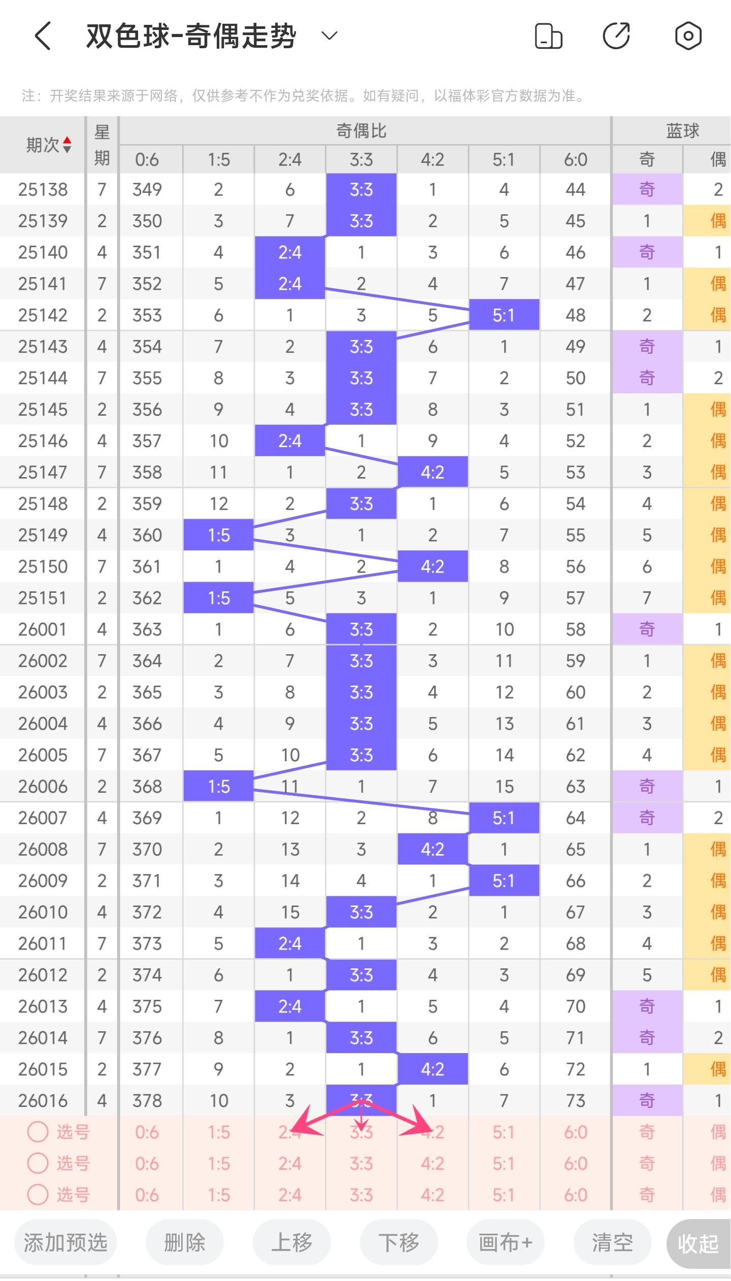 上期开出的是13,往前一期开出的是12。趋势往右移动,偏移量为1。通过分析目前蓝球的走势图,目前趋势是大概率往左的。从偏移量看,上期偏移量是1,往前一期是11,偏移量变化比较大,本期有可能又突然变大,也可能继续开小偏移量的,所以本期小和大偏移量的号码都关注一下。从冷温情况来看,还是比较看好冷号回补。最后再结合遗漏期数,以及冷热号,本期我们可以关注3,5,6,9,11等号码。综上所述本期推测可能开出3,5,6,9,11等号码。