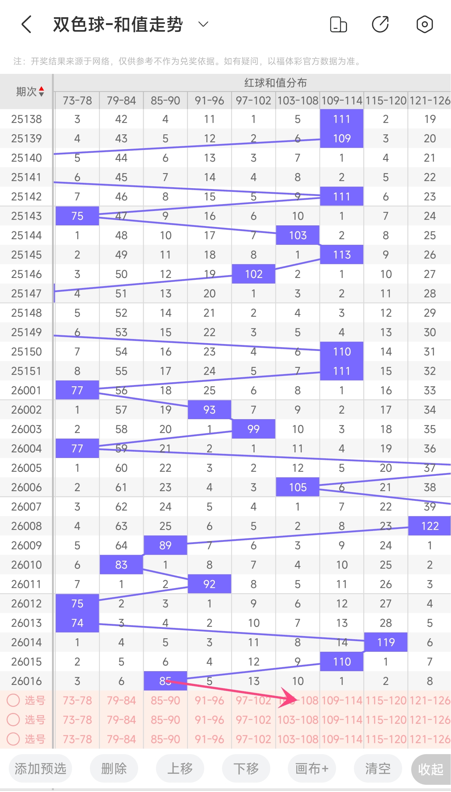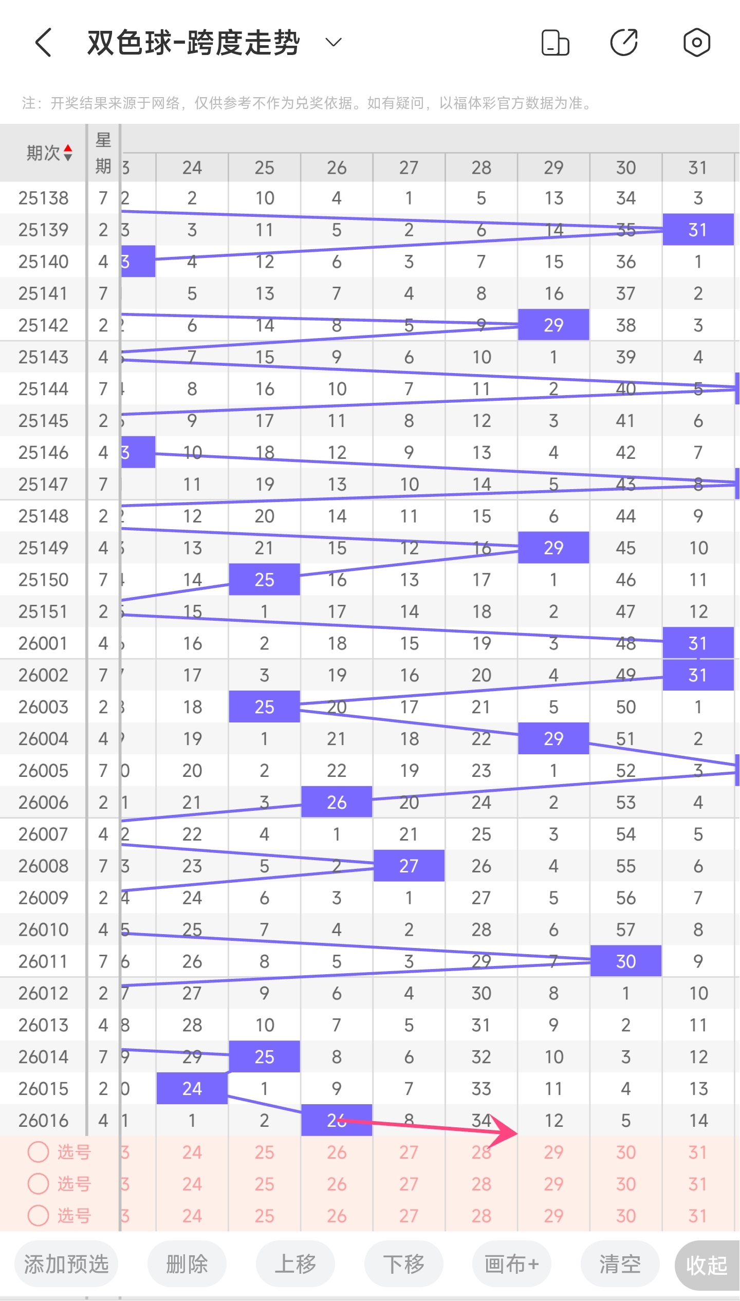 上期龙头为4,凤尾为30,跨度为26,往前一期跨度是24,偏移量为2。26跨度值是30期内开出中间的跨度值。上升的空间和下降空间差不多,本期看好跨度变大,所以推测本期跨度趋势是往右的,跨度变大,小概率往左,跨度变小。