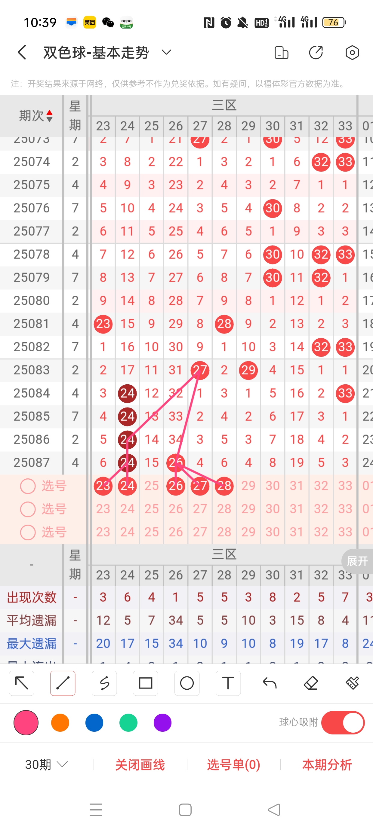 三区(23-33)近85期本区邻孤传37邻73孤6传,孤号热度高,本期着重邻传。近85期本区012路45:35:42,0/2路热度高,本着重1路。23已遗漏6期,24作为传号,两者与24之间呈现向左对称遗漏递减态势,需防。26作为传号,呈现直落回补态势,需防。27、28分别遗漏4期、6期,两者与26之间呈现向右遗漏递减态势,需防。