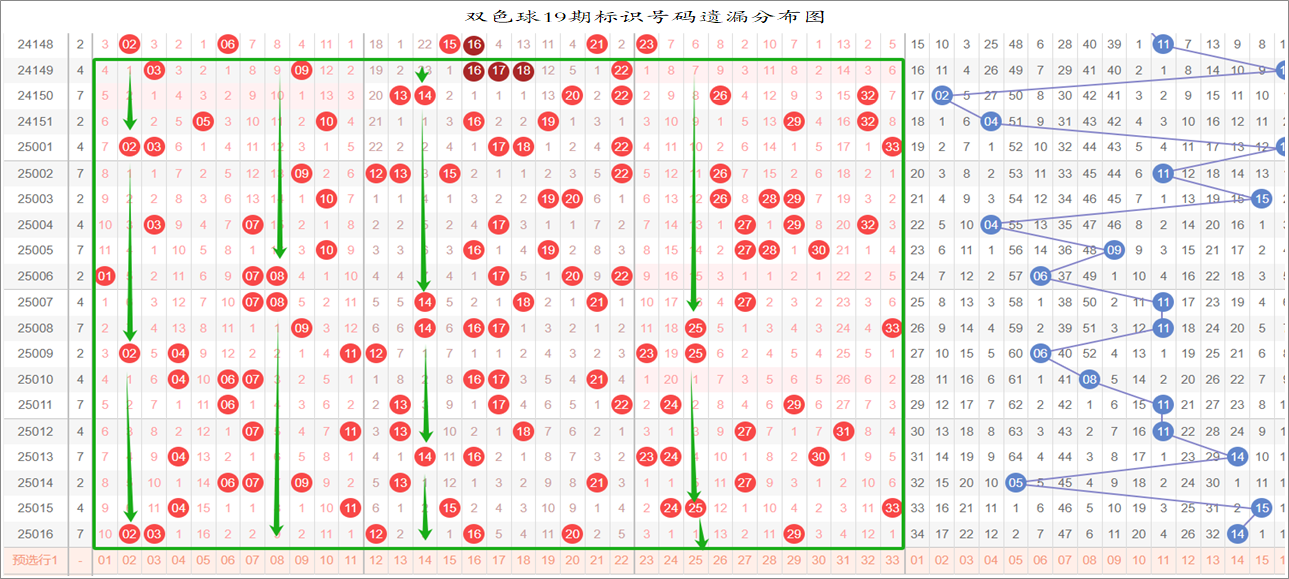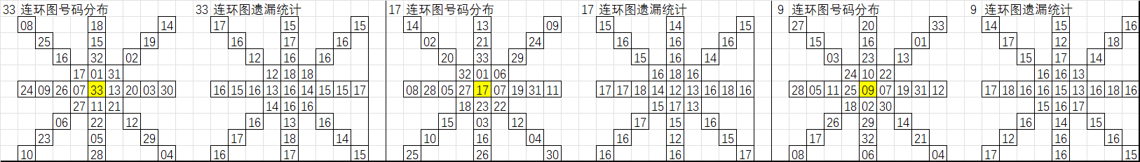 由于数据量大,不一一统计,下图为各个号码分别在33、17、9连环图上的遗漏统计汇总图: