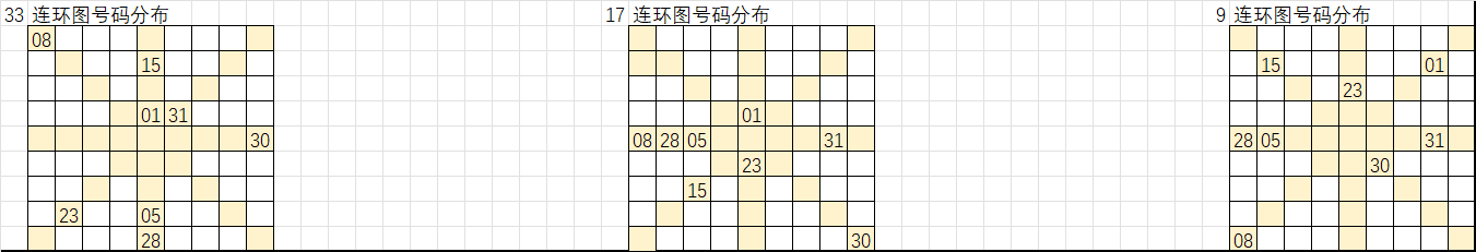 以上是33、17、9的连环图,可以在一起彩平台的九转连环图中查看历期号码分布,以当前期数来看,历史同期共有19期(2003-2023),那么我们就以19期号码来进行遗漏统计,然后把每个号码在近19期的遗漏总数统计出来,分别带入33、17、9的连环图,取出遗漏值大于16的号码,把这些号码在“环上”和“轴上”的相邻号码取出来进行统计,选取出次前15的号码作为大底。