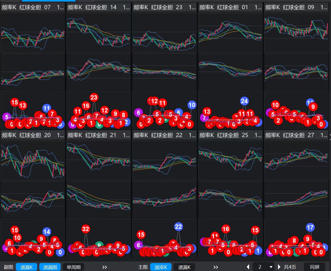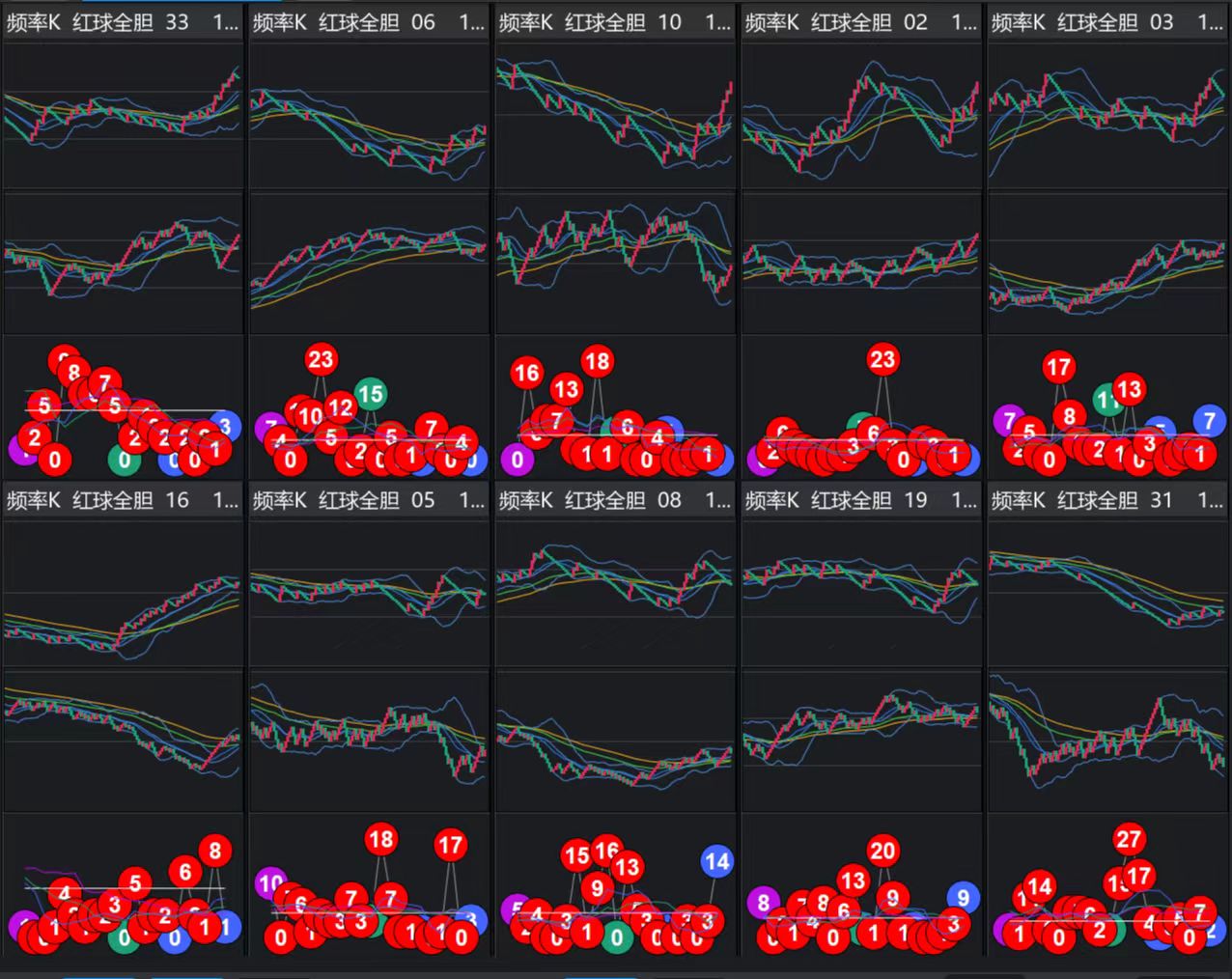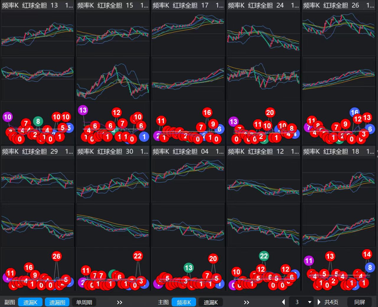 防守号码:15、26、29、30、04、18(K值虽未明确上升,但存在小概率波动)可适当补充防范。剩下的3个红球号码含28、11、32,因为K值 均呈下降趋势,出号概率极低,所以图就不给大家呈现出来了。