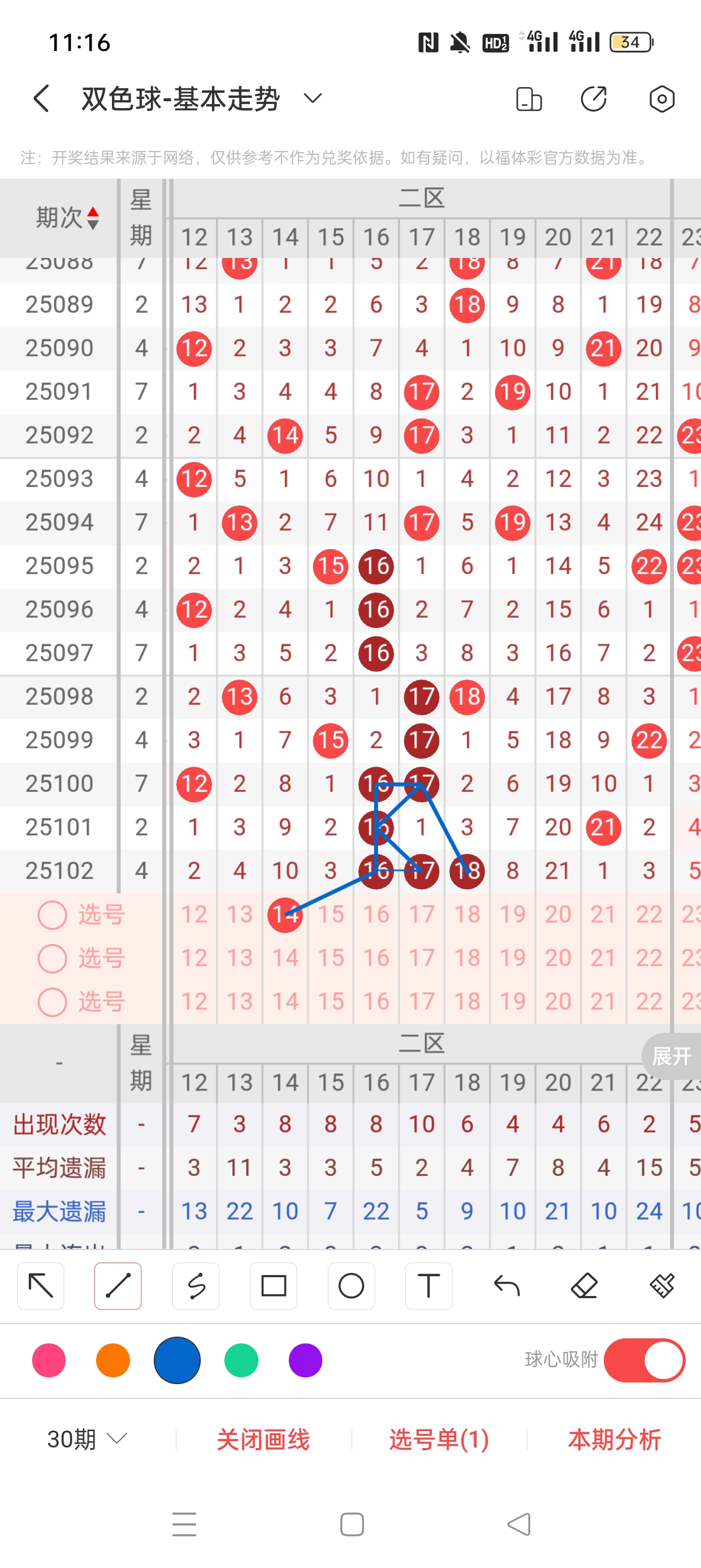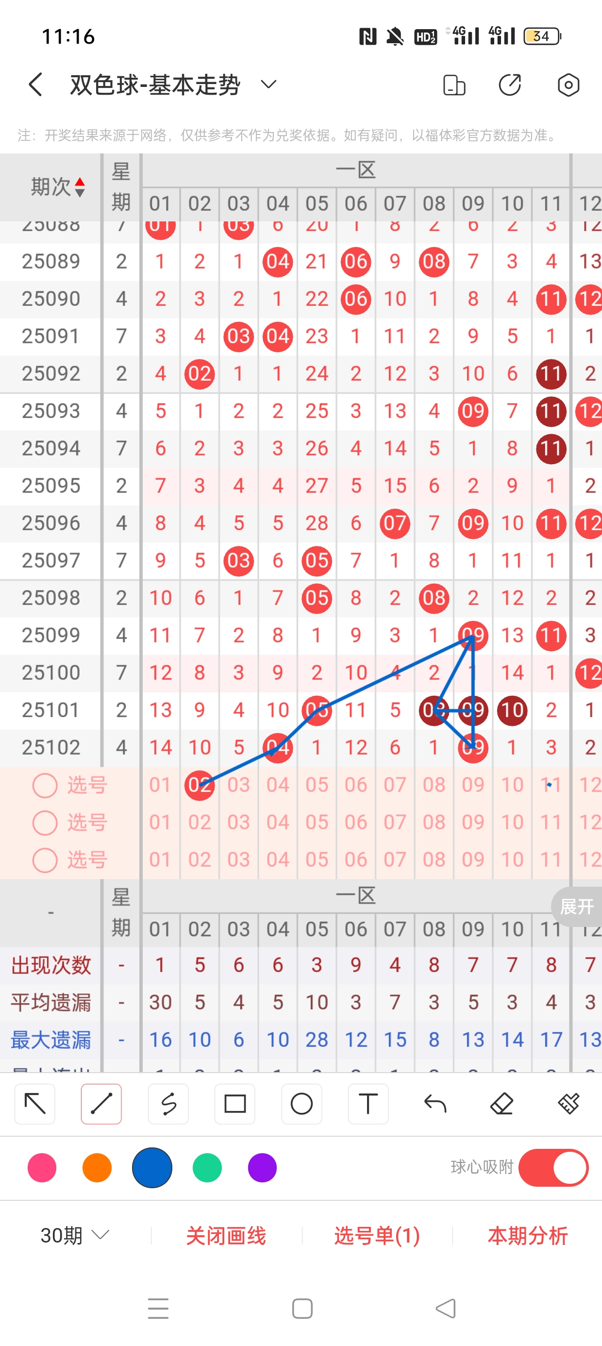 后区(1-16)近100期本区012路23:32:47,1/2路热度高,本期着重0路。2已遗漏4期,与5之间呈现向左遗漏递减态势,需防。