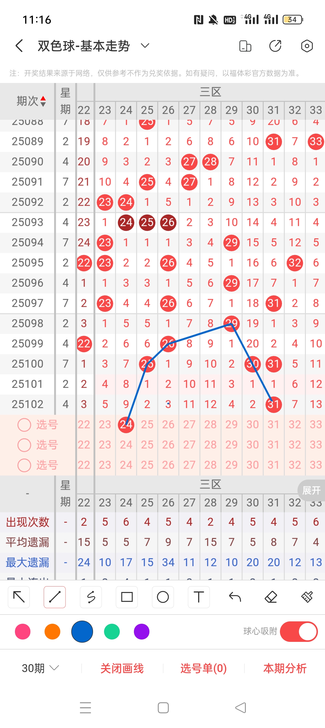 三区(23-33)近100期本区邻孤传43邻82孤6传,孤号热度高,本期着重邻传。近100期本区012路46:45:46,0/2路热度高,本着重1路。24已遗漏9期,与25之间呈现向左遗漏递减态势,需防。