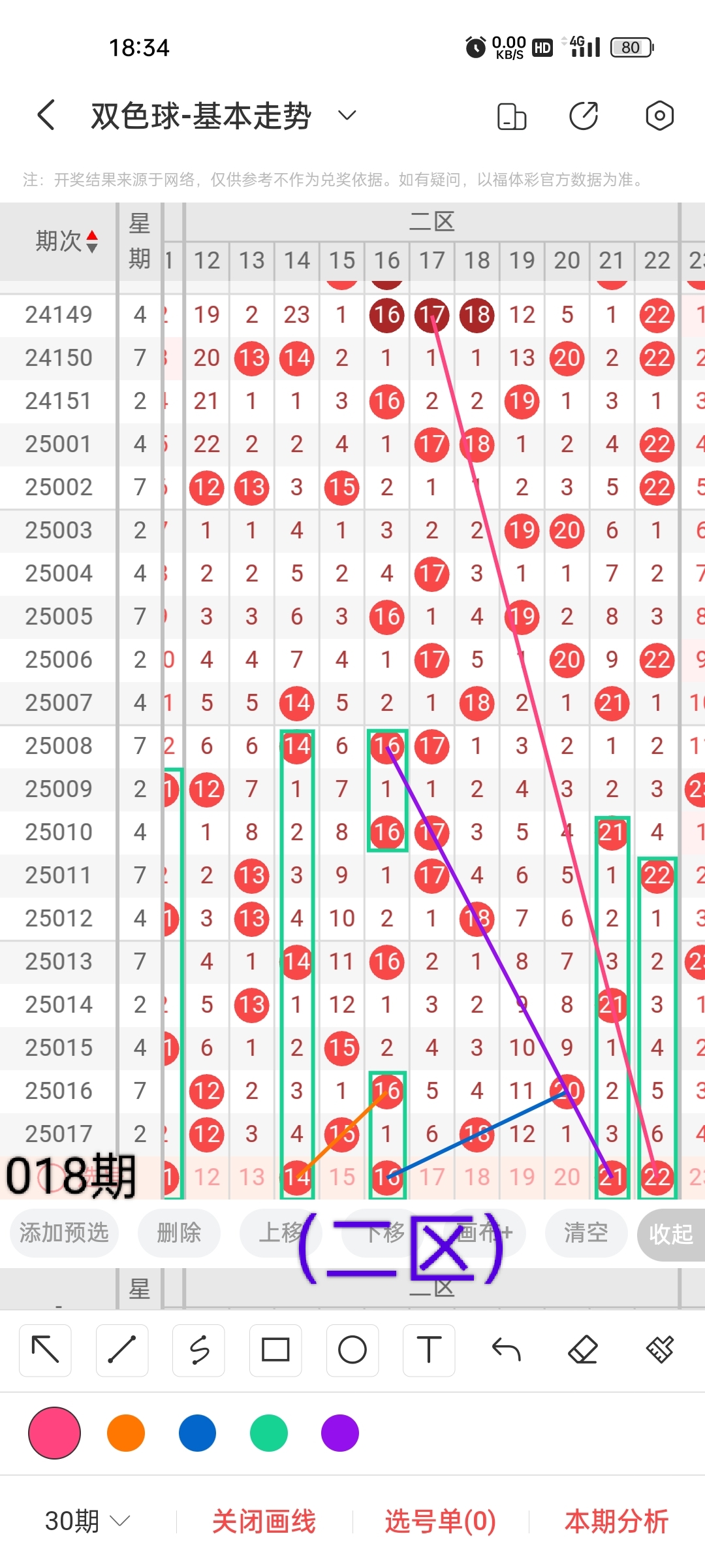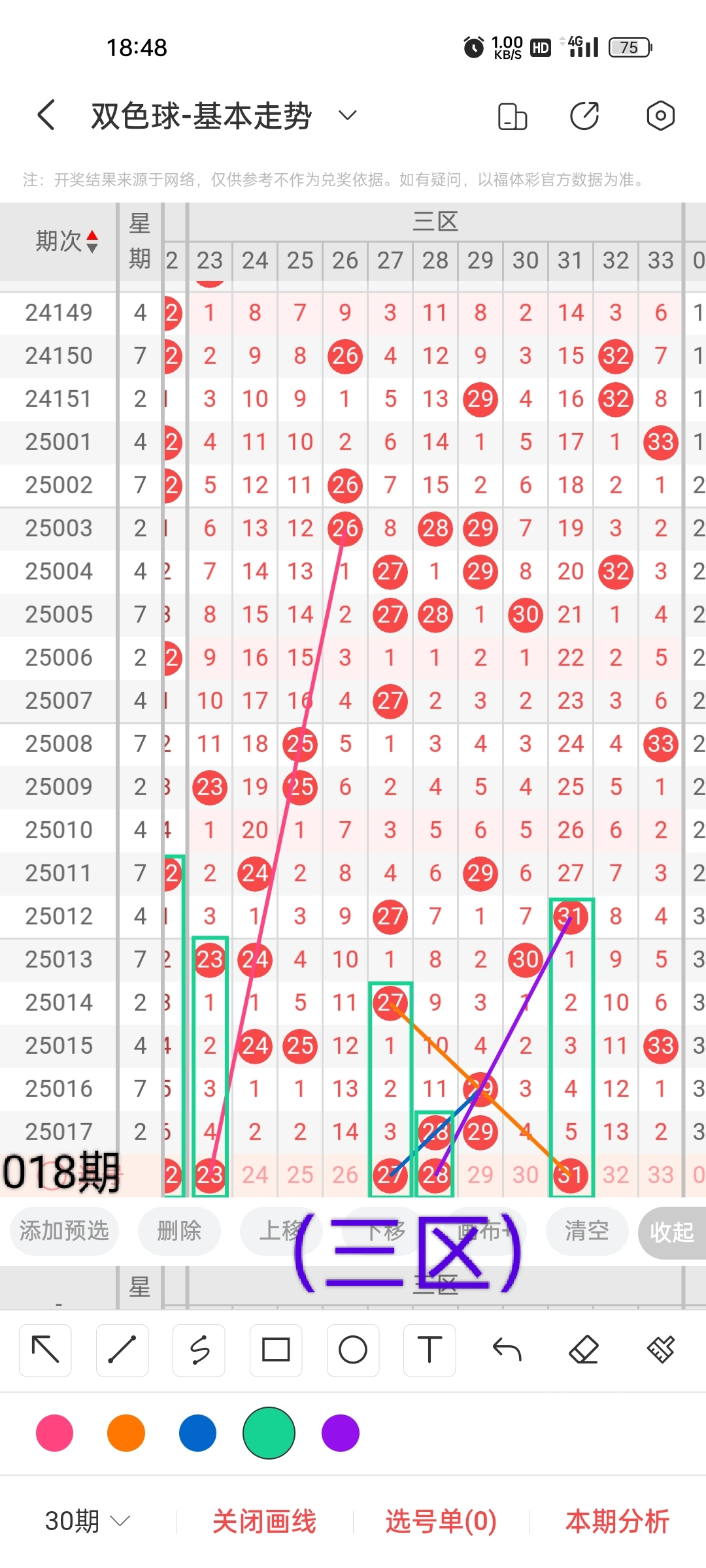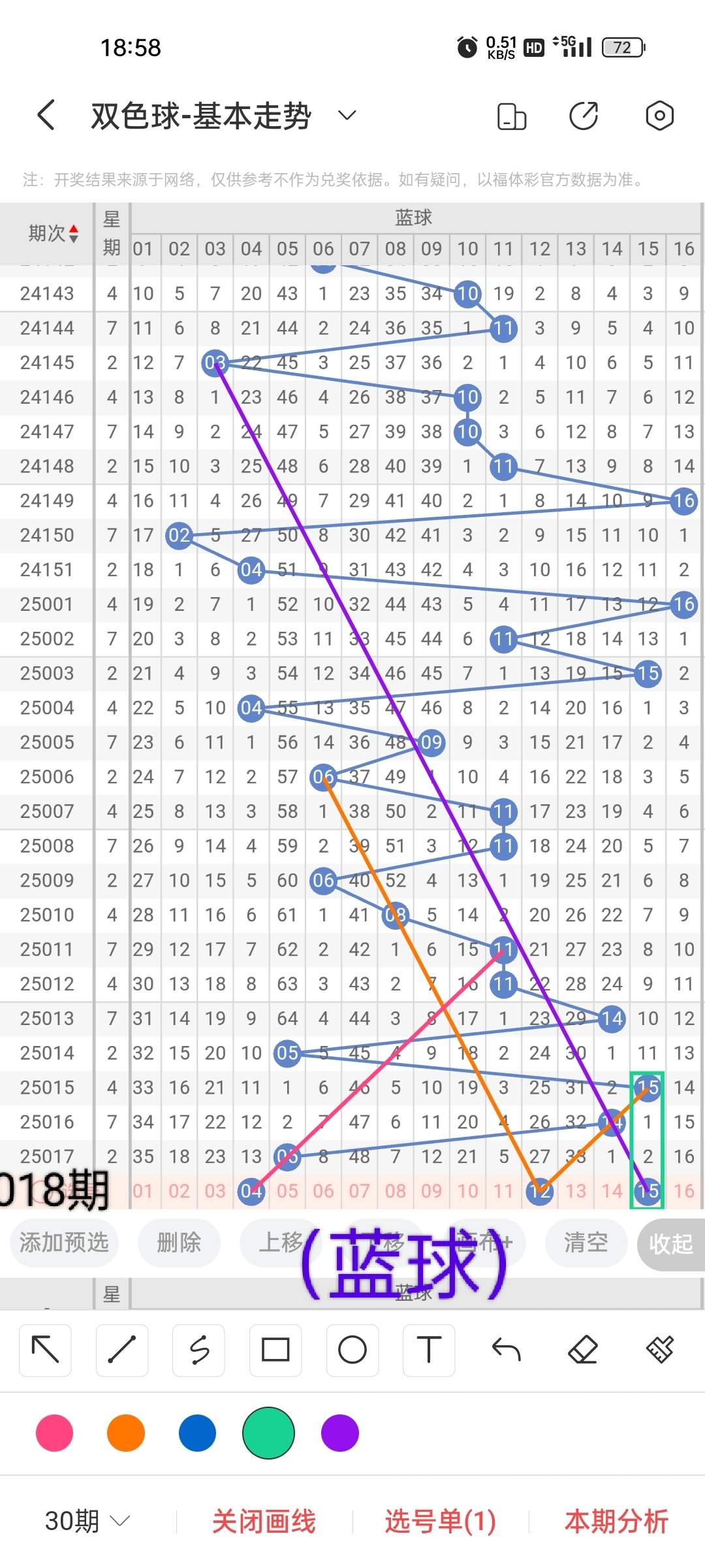 小梁根据图中画线思路,最后给大家汇总提供一下本期红球、蓝球数据,供大家参考: