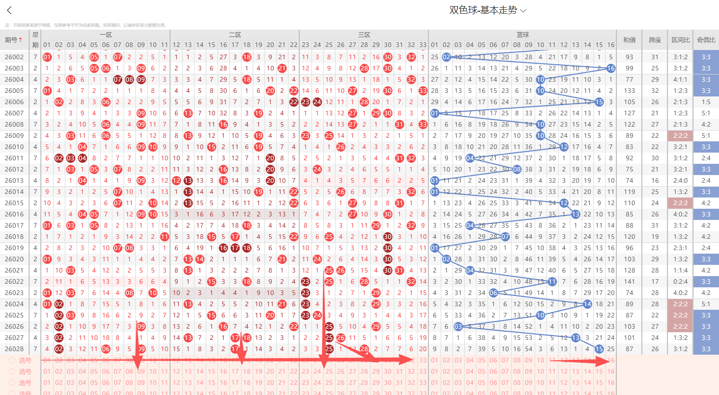 1、红球特征分析:(通过整体走势不难看出每期开奖号都具备以下明显的特征点)
