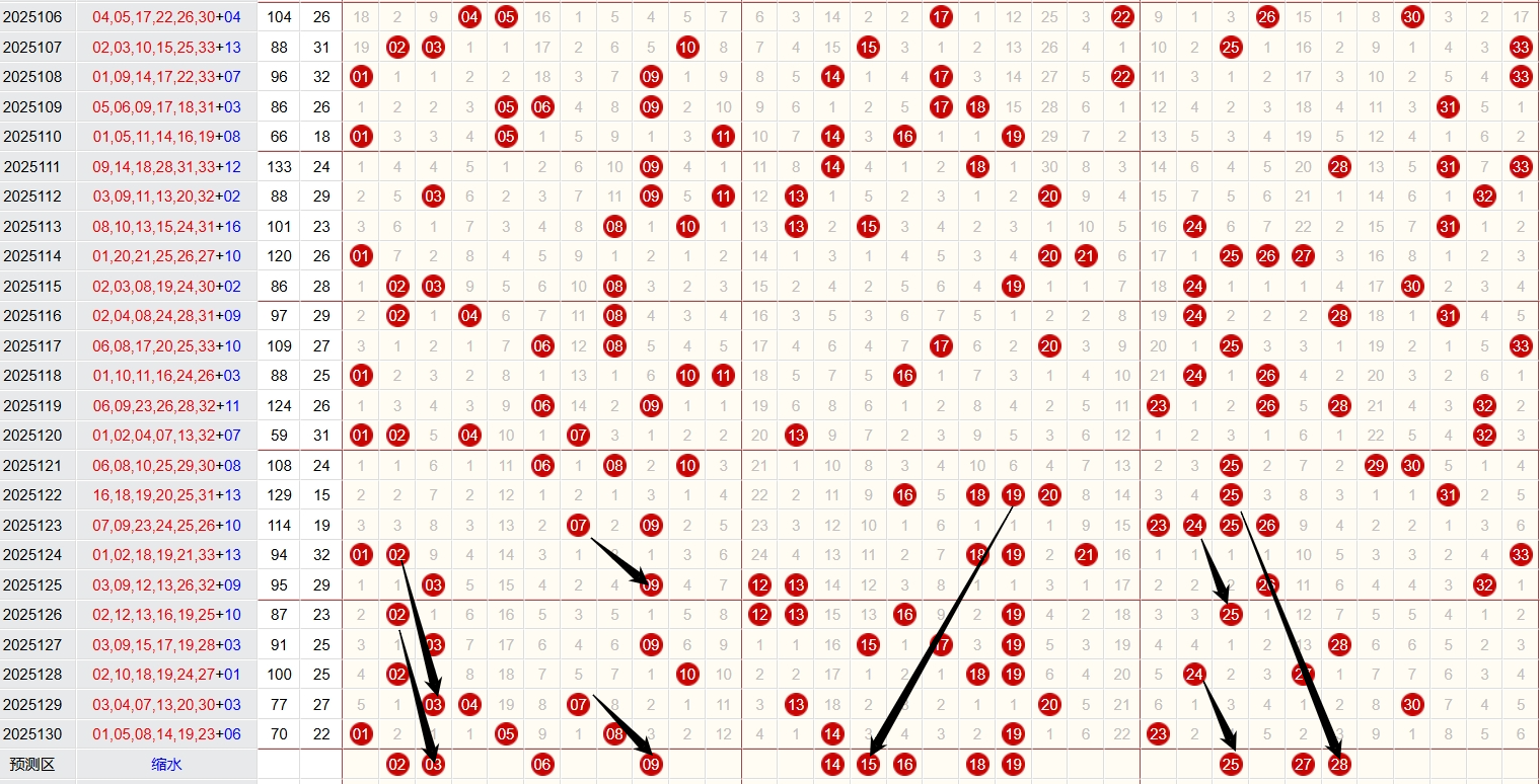 回顾上期25130期开奖005 08 14 19 23 + 06 ,其中一小区01-11出3个,二小区12-22出2个号,三小区23-33出1个!