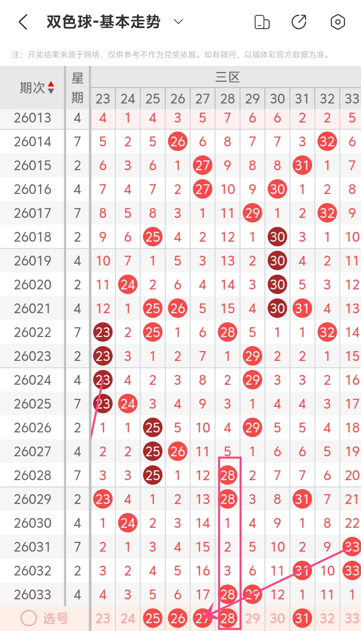 下面双色球的第三区间走势图分析: