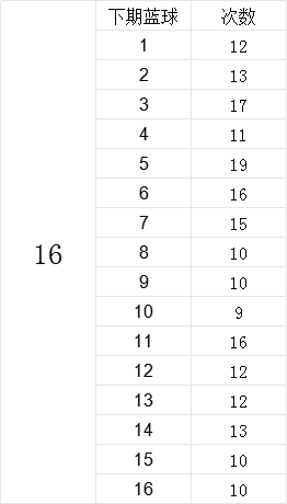统计历史一共开出多少期蓝球16,再统计一下下期开出的蓝球次数。