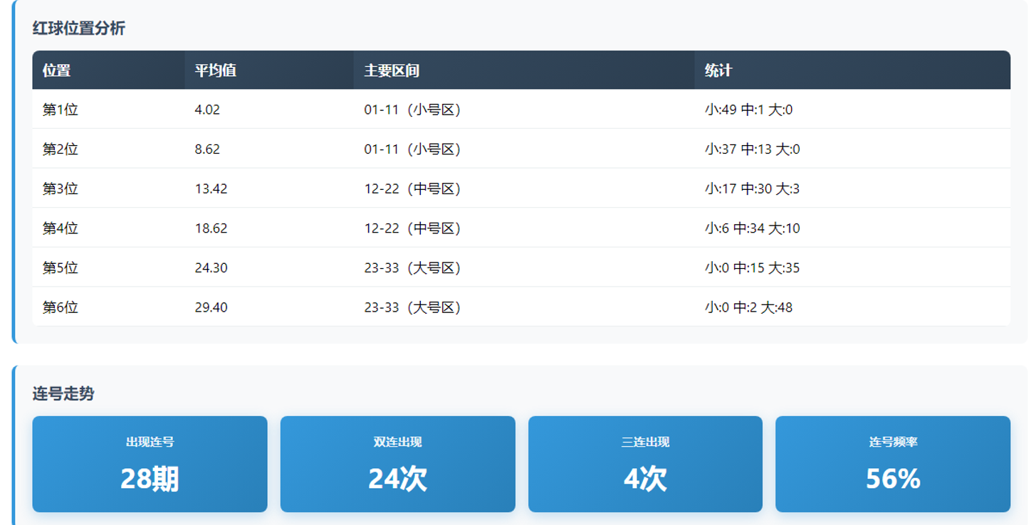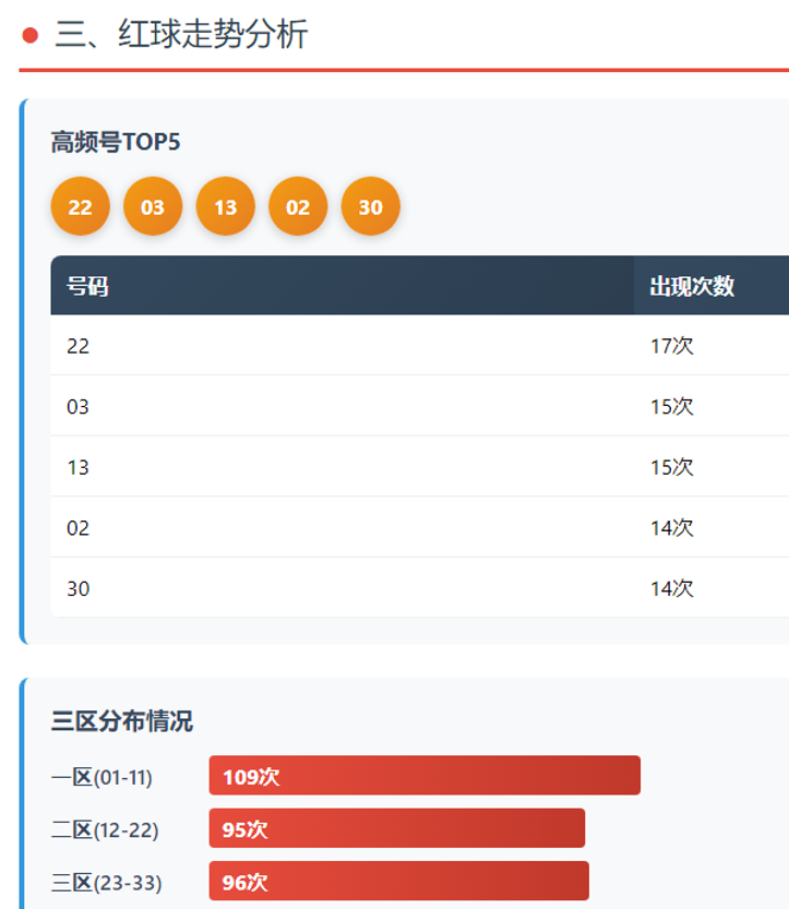 三区分布:一区(01-11)出109枚占36.3%,二区(12-22)出95枚占31.7%,三区(23-33)出96枚占32.0%。一区略占优势,二三区基本持平。