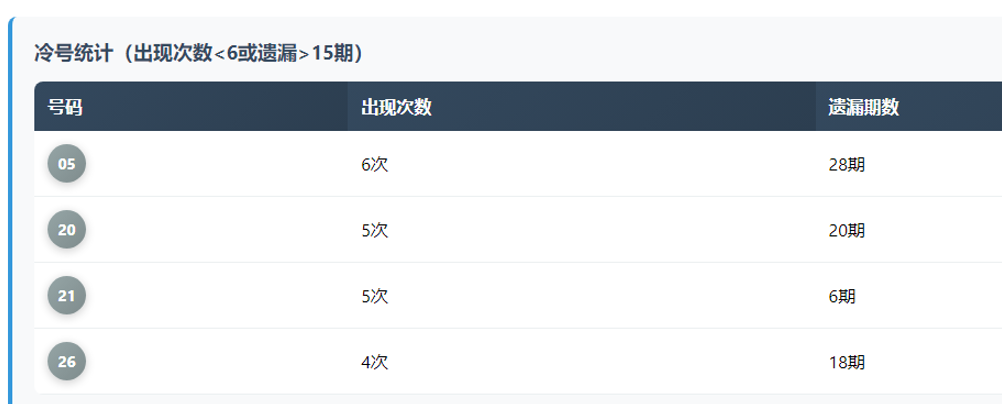 冷号回补这边,05号遗漏28期是最大的回补信号。20号和26号也进入了该回来的时间窗口。21号总出现次数偏低,也值得留意。