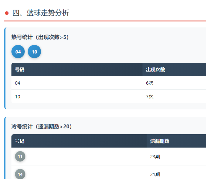 蓝球方面,10号7次居热号榜首,04号6次跟在后面。冷号里09号遗漏50期——半个多世纪没出现了——11号遗漏23期,14号遗漏21期。09号值得特别留意,这么长的遗漏在16个球的范围里确实不多见。