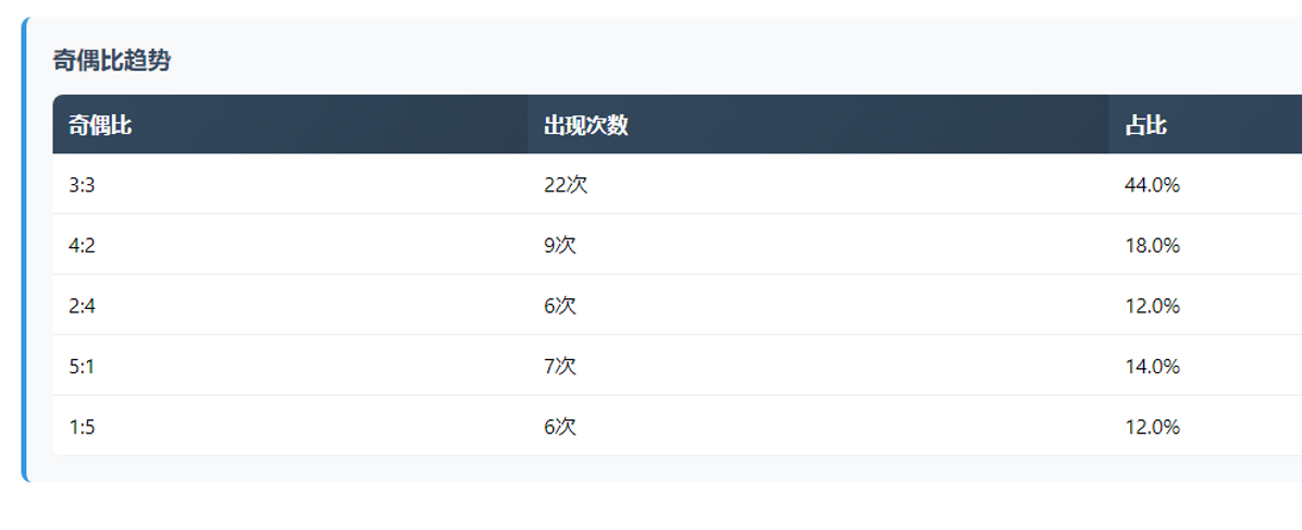 奇偶比3:3是绝对主流22次,4:2次之9次,5:1也有7次。2:4和1:5各6次。偏奇偏偶比例相对均衡,但3:3和4:2加起来占了近三分之二。