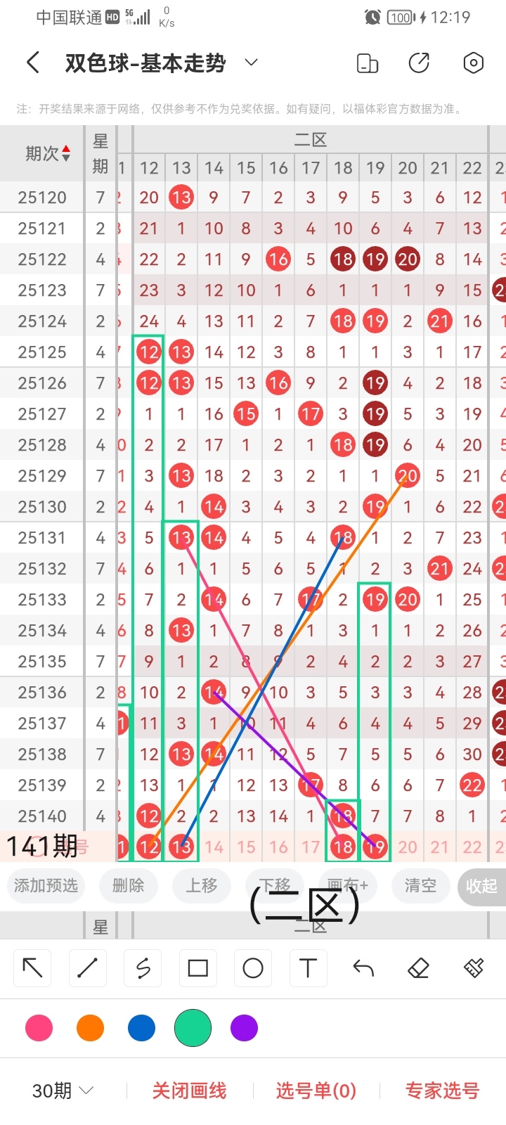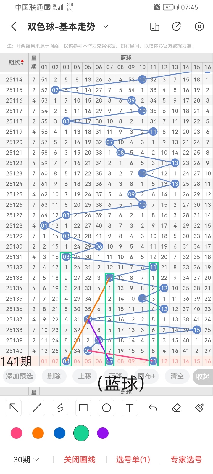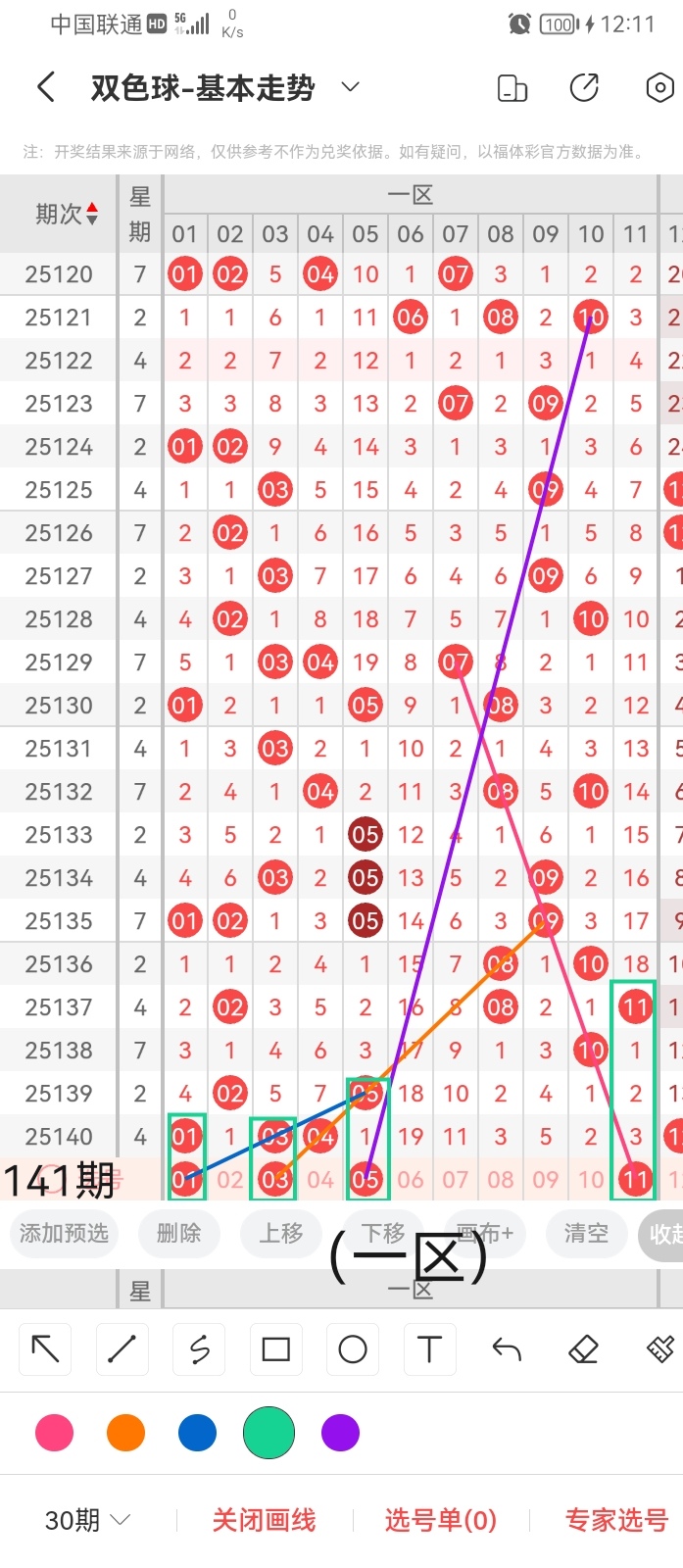 小梁根据图中画线思路,最后给大家汇总提供一下本期红球、蓝球数据,供大家参考: