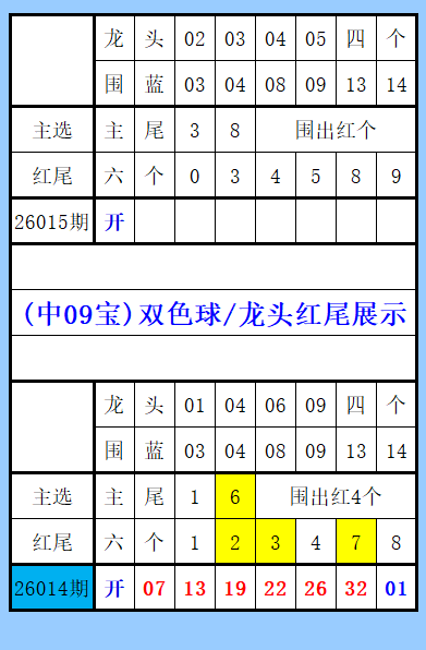 本期26015期一注单选参考号码5:红球08、14、17、20、28、32,蓝球13。