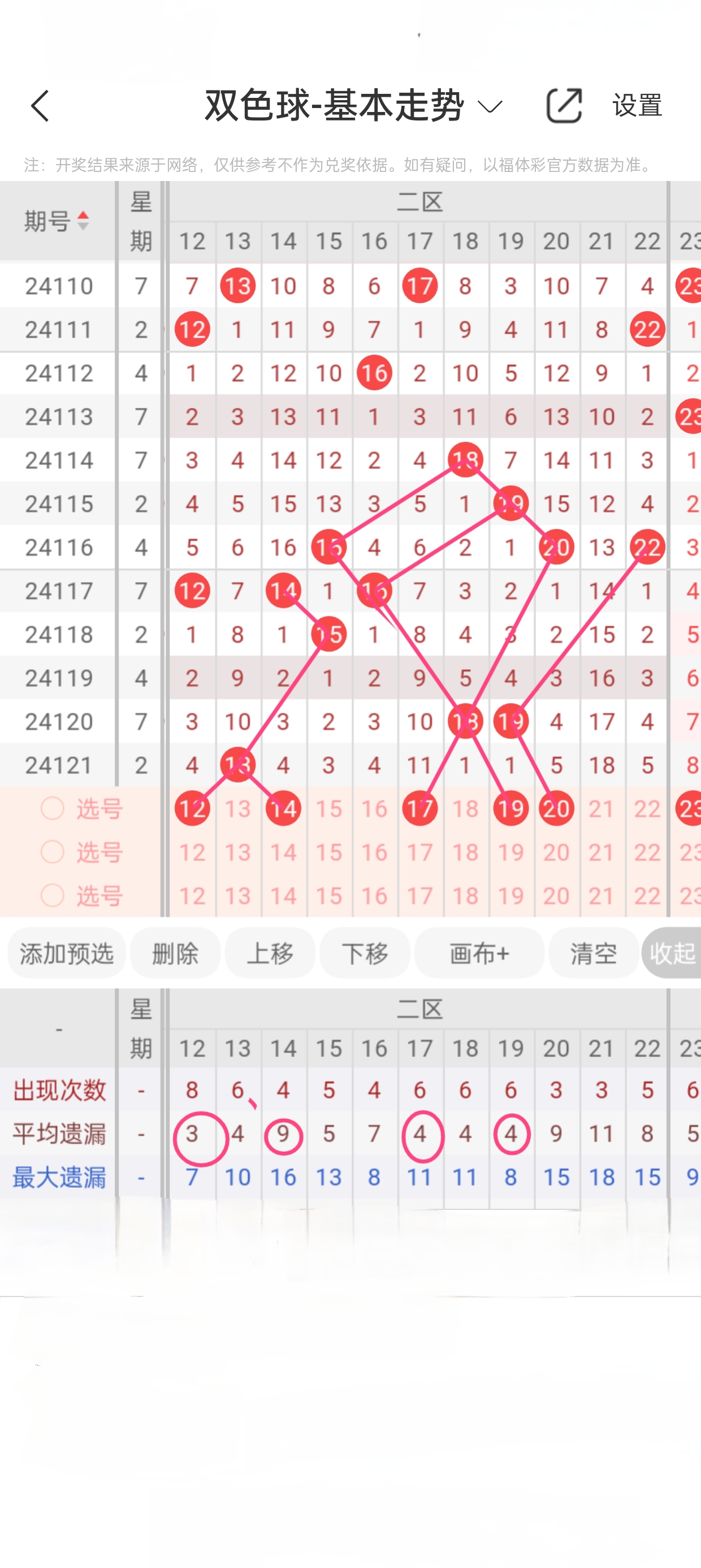 后区(1-16)近11期本区012路4:5:2,1路热度高,本期着重0/2路回补。5已遗漏21期,与3之间呈现向右遗漏递减态势,需防。6、8分别遗漏49期、13期,遗漏均值49、21,两者依托7呈现正三角遗漏递减态势,做重点。13、15分别遗漏25期、18期,遗漏均值36、35,两者依托14呈现正三角遗漏递减态势,做重点。本区重点6、8、13、15,关注5。