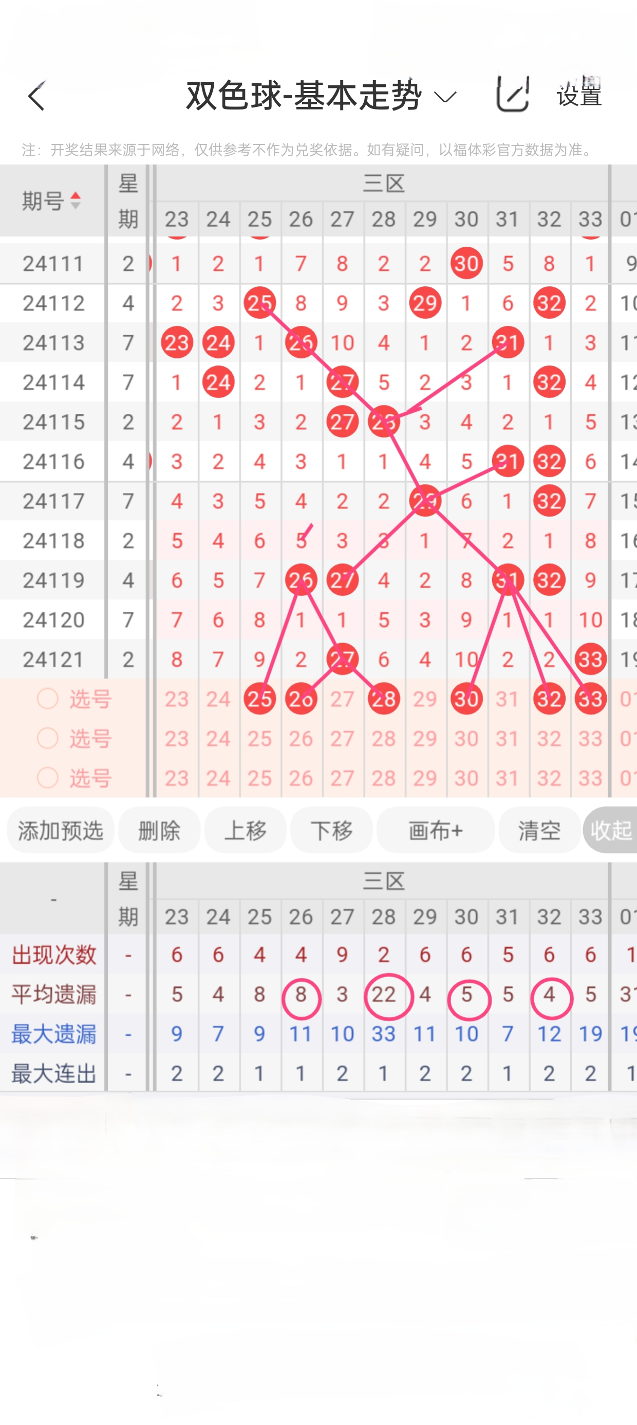 三区(23-33)近11期本区邻孤传11邻10孤3传,传号热度低,本期着重邻传。近11期本区012路8:4:10,2路热度高,本期着重0/1路回补。25已遗漏9期,与26之间呈现向左遗漏递减态势,需防。26、28分别遗漏2期、6期,遗漏均值8、22,两者依托27呈现正三角遗漏递减态势,做重点。30、32分别遗漏10期、2期,遗漏均值5、4,两者依托31呈现正三角遗漏递减态势,做重点。33作为传号与31之间呈现向右遗漏递减态势,需防。本区重点26、28、30、32,关注25、33。