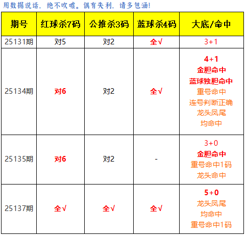 上期红球杀7码对6,公推红球杀3码对2,蓝球杀4码全对,重号命中1码,和值范围正确。本期再接再厉!
