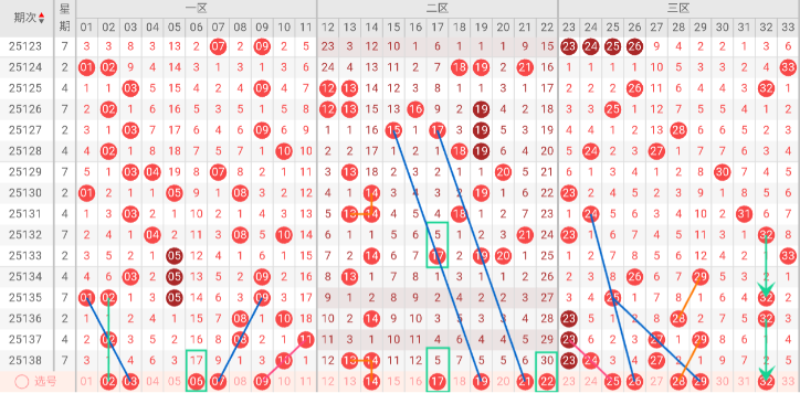 第三区间(23-33):三区上期开出号码23 24 27,近5期出号量2-2-3-3-3。本期三连号趋势:25,隔码斜连趋势:26 29。近5期平均出号2.6枚,平均出号增加。呈现稳健上升并维持高位的态势,是目前最热的区间。三区连续三期出3个,历史罕见。连续多期维持3个高位出号后,存在小幅降温的可能,但~。本期~。重点~。建议关注号码:25、26、28、29、32。