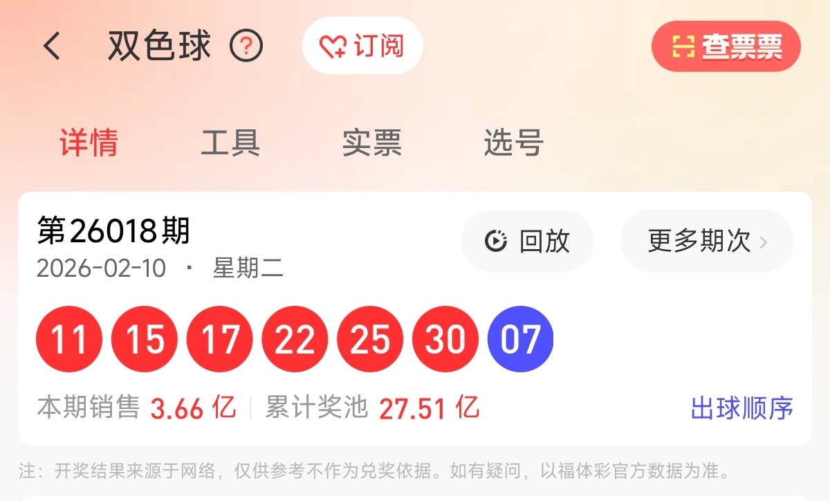 首先让我们回顾一下上期双色球26018期的开奖号码为 11、15、17、22、25、30,蓝球07。和值120,跨度19,区间比为1:3:2,奇偶比为4:2。