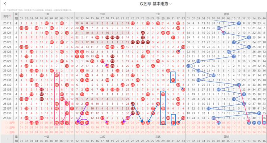 上一期三区开出了2个号码,本期三区大概率不会断区,本期三区出号数量看好2-3个;本期三区需要关注的号码:25与23-24形成了斜连走势;25-26可能会一起落号;29-32为邻号;31-32可能会一起落号;因此本期三区选号应该考虑25-26-29-31-32等号码。