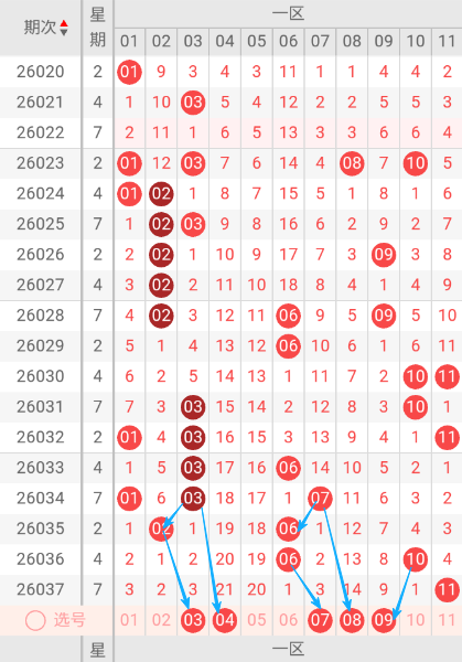 根据走势图可以看出当区段,026期开出02.09二个号码球 ,027期开出02一个号码球 ,028期开出02.06.09三个号码球 ,029期开出06一个号码球 ,030期开出10.11二个号码球 ,031期开出03.10个号码球 ,033期开出03.06二个号码球 ,034期开出01.03.07三个号码球 ,036期开出06.10二个号码球 ,037期开出11一个号码球 ,按照如此规律本期当前区判断可能会开出1单1双。我们看下当前区上期没有开出重叠号,那么本期当前区要定重叠号的情况下可关注11号码球。再看下当前区段上期开出11斜连号,当期选号得留意10斜连号。建议重点关注03.04.07.08.09