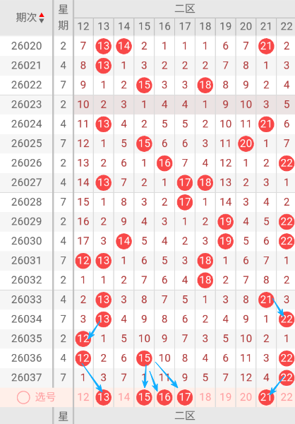 根据走势图可以看出当前区段,025期开出15.20二个号码球 ,026期开出16.22二个号码球 ,027期开出13.17.18三个号码球 ,028期开出17一个号码球 ,029期开出19.22二个号码球 ,030期开出14.19.22三个号码球 ,031期开出12.13.18三个号码球 ,033期开出13.21二个号码球 ,034期开出13.22二个号码球 ,036期开出12.15.22三个号码球 ,037期开出22一个号码球 ,按照如此规律本期当前区可能开出1单1双。我们看下当前区上期开出22重叠号,那么本期当前区要定重叠号的情况下可关注22号码球。再看下当前区上期没有开出斜连号,当期选号得留意斜连21号码球。本区重点关注13.15.16.17.21