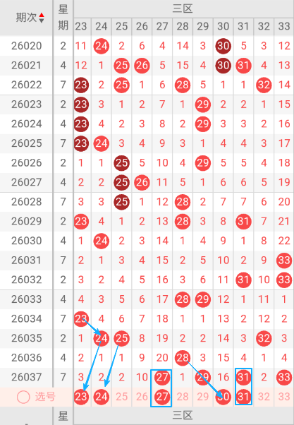 根据走势图可以看出当前区, 026期开出25.29二个号码球 ,027期开出25.26二个号码球 ,028期开出25.28二个号码球 ,029期开出23.28.31三个号码球 ,030期开出24一个号码球 ,031期开出33一个号码球 ,033期开出28.29二个号码球 ,034期开出23一个号码球 ,036期开出28一个号码球 ,037期开出27.29.31.33四个号码球 ,按照如此规律判断本期当前区可能开出2单。我们看下当前区上期没有开出重叠号,那么本期当前区要定重叠号的情况下可关注27码球。再看下当前区上期开出27.29斜连号,当期选号得留意30斜连号。本区重点关注23.24.27.30.31
