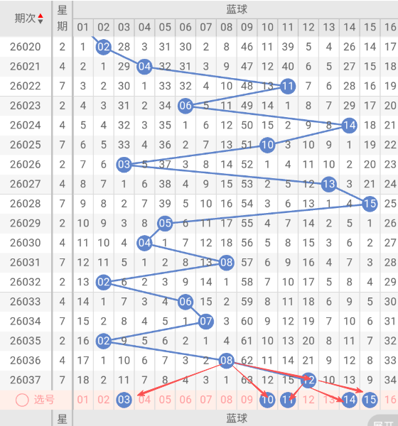 根据走势图近10期的走势看,蓝球在14期开出01蓝球之后,2大5小1大1小2大1小2大8小1大,再看下近10期的蓝球中冷码有回补的趋势,这种趋势规律本期判断极有可能开大号,本期防蓝球14大号,蓝球本期重点关注03,10,11,14,15