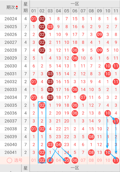 根据走势图可以看出当区段,028期开出02.06.09三个号码球 ,029期开出06一个号码球 ,030期开出10.11二个号码球 ,031期开出03.10个号码球 ,033期开出03.06二个号码球 ,034期开出01.03.07三个号码球 ,036期开出06.10二个号码球 ,037期开出11一个号码球 ,038期开出01.02二个号码球 ,041期开出02.08.10三个号码球 ,按照如此规律本期当前区判断可能会开出1单1双。我们看下当前区上期没有开出重叠号,那么本期当前区要定重叠号的情况下可关注10号码球。再看下当前区段上期开出02斜连号,当期选号得留意11斜连号。建议重点关注02.03.05.06.11