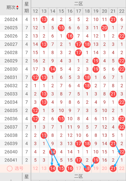 根据走势图可以看出当前区段,027期开出13.17.18三个号码球 ,028期开出17一个号码球 ,029期开出19.22二个号码球 ,030期开出14.19.22三个号码球 ,031期开出12.13.18三个号码球 ,033期开出13.21二个号码球 ,034期开出13.22二个号码球 ,036期开出12.15.22三个号码球 ,037期开出22一个号码球 ,038期开出13一个号码球 ,042期开出17.19二个号码球 ,按照如此规律本期当前区可能开出1单1双或2双。我们看下当前区上期没有开出重叠号,那么本期当前区要定重叠号的情况下可关注17号码球。再看下当前区上期没有开出斜连号,当期选号得留意斜连18号码球。本区重点关注14.15.16.18.21
