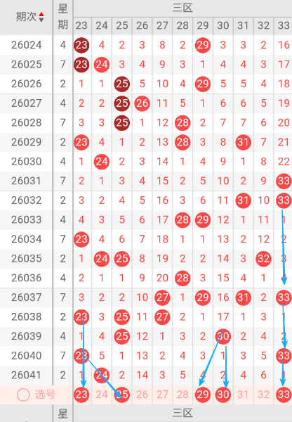 根据走势图可以看出当前区, 028期开出25.28二个号码球 ,029期开出23.28.31三个号码球 ,030期开出24一个号码球 ,031期开出33一个号码球 ,033期开出28.29二个号码球 ,034期开出23一个号码球 ,036期开出28一个号码球 ,037期开出27.29.31.33四个号码球 ,038期开出23.25.27三个号码球 ,041期开出24一个号码球 ,按照如此规律判断本期当前区可能开出2单或1单1双。我们看下当前区上期没有开出重叠号,那么本期当前区要定重叠号的情况下可关注24码球。再看下当前区上期开出24斜连号,当期选号得留意23斜连号。本区重点关注23.25.29.30.33