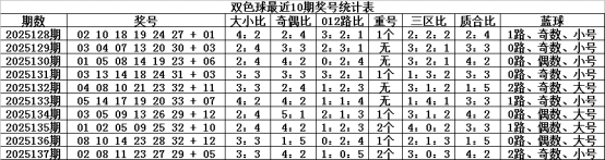 上期奇偶比为4:2,奇数活跃,近10期奇偶比为32:28,奇数红球活跃,其中奇数红球热