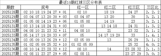 一区上期走热,开出3个红球,近10期开出25个红球,表现非常活跃,本期注意走冷,防断区;二区上期走冷断区,近10期共开出16个红球,走势相对较冷,本期注意回补,看好该区热出,关注3个红球,注意号码12、14、15;三区上期表现较热,出现3个奖号,近10期共开出19个红球,出号与理论个数持平,本期看好走热,开出3个红球,看好号码23、26、29;