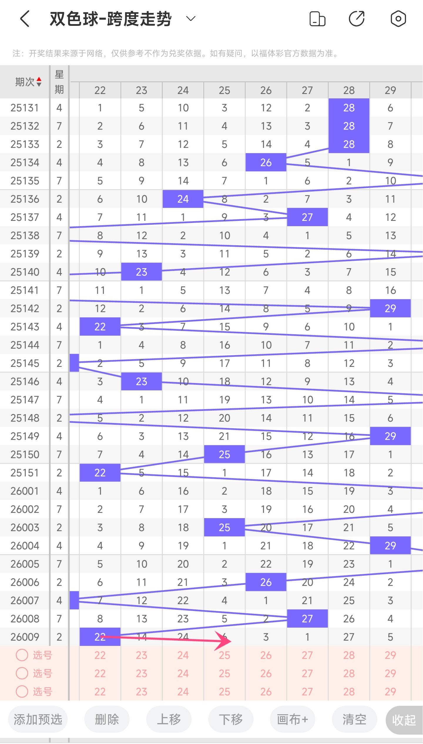 上期龙头为3,凤尾为25,跨度为22,往前一期跨度是27,偏移量为5。22跨度值是30期内开出比较小跨度值。上升的空间很大,下降空间很小,本期看好跨度变大,所以推测本期跨度趋势是往右的,跨度变大,极小概率往左,跨度变小。