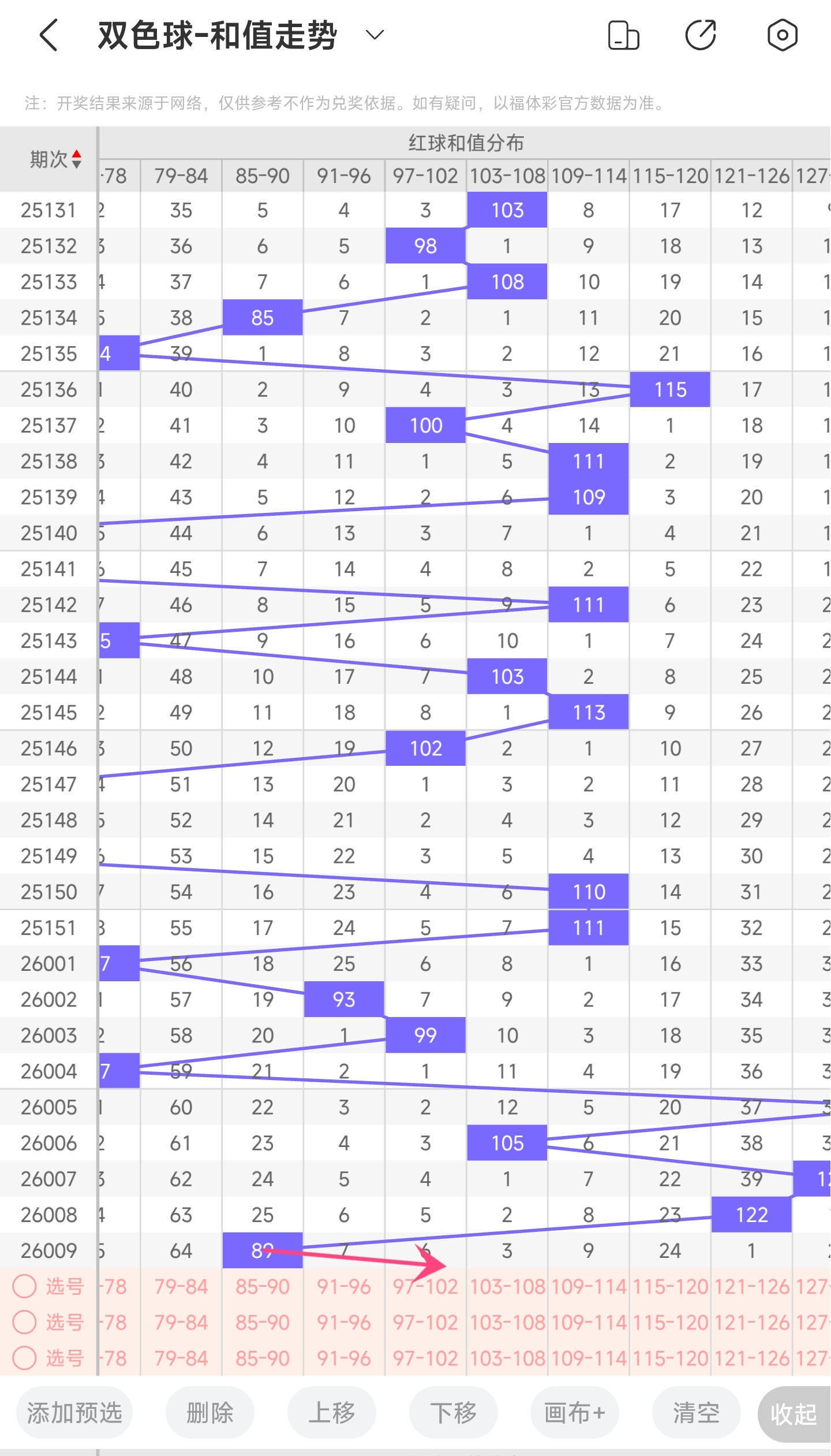 上期和值为89,而近5期和值为133,105,127,122,89,上期和值较前一期减少了33,振幅为33。89和值是属于近30期内开出的比较小的和值,下降的空间比较小,上升的空间比较大。本期看好和值变大,所以推测本期和值趋势是大概率往右,和值变大,小概率往左,和值变小。