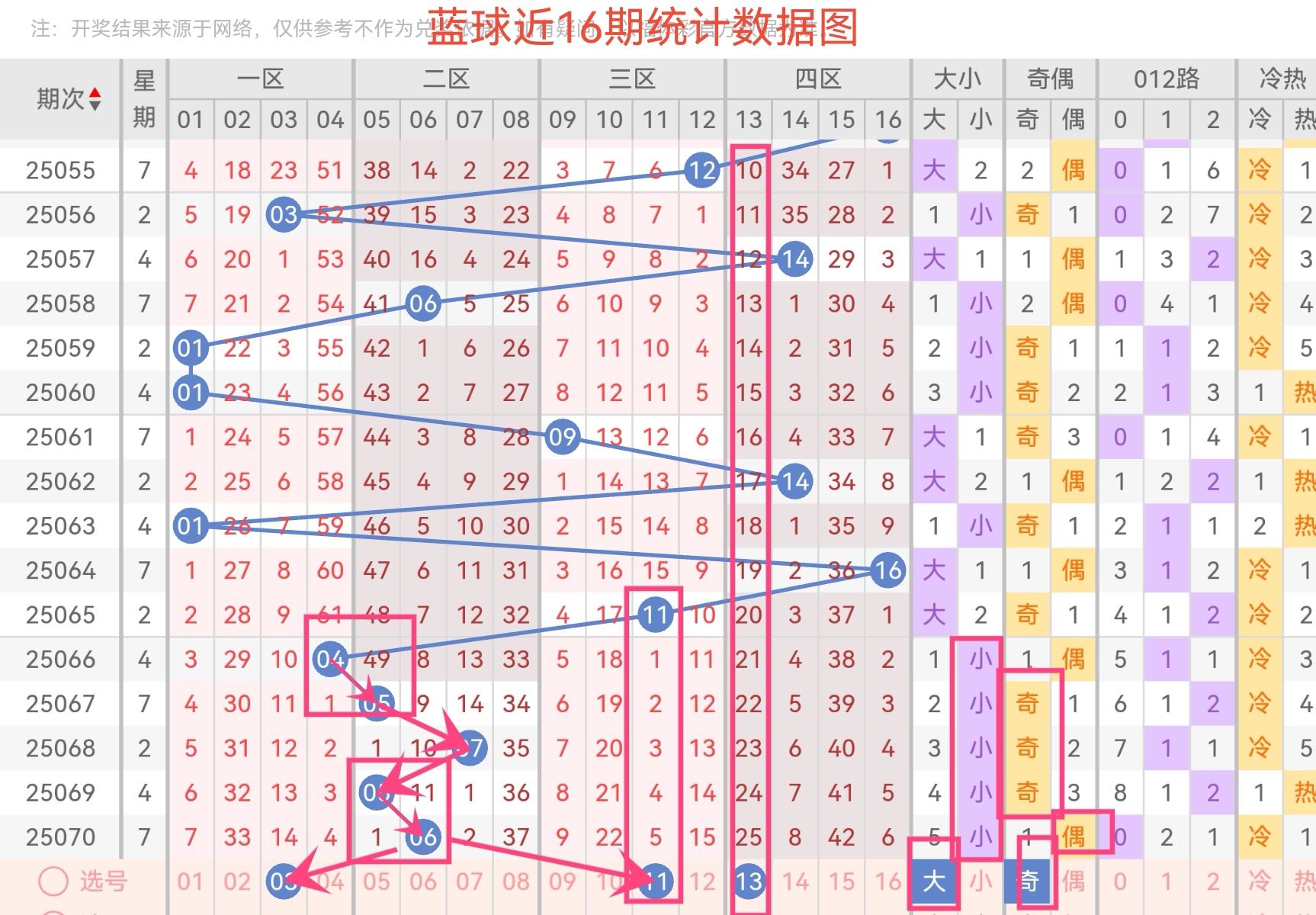 奇偶比:近10期奇蓝球占60%,本期看好奇数(01、03、11、13)。