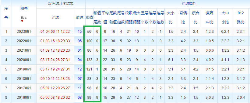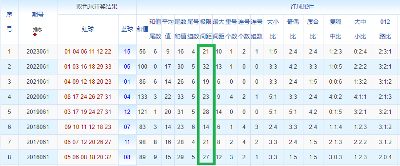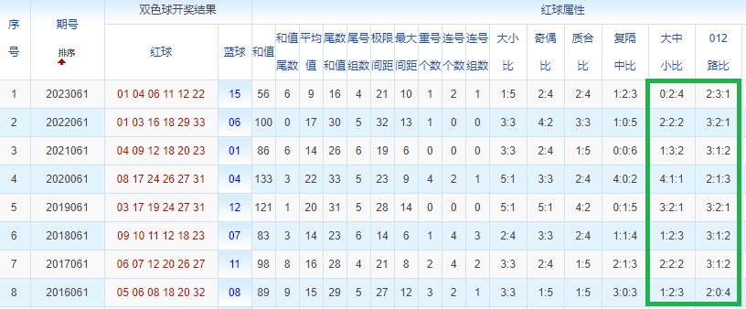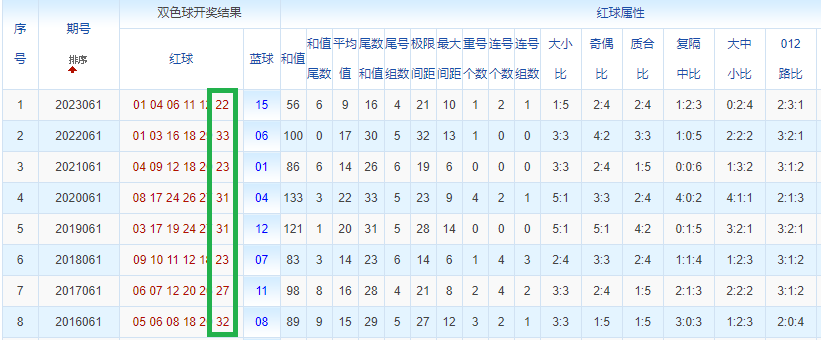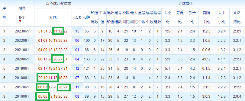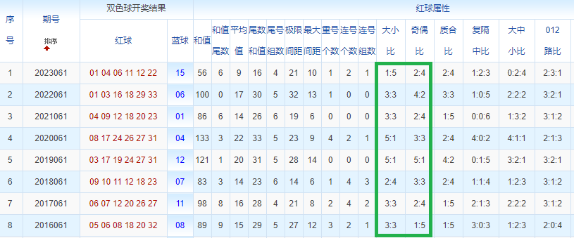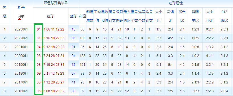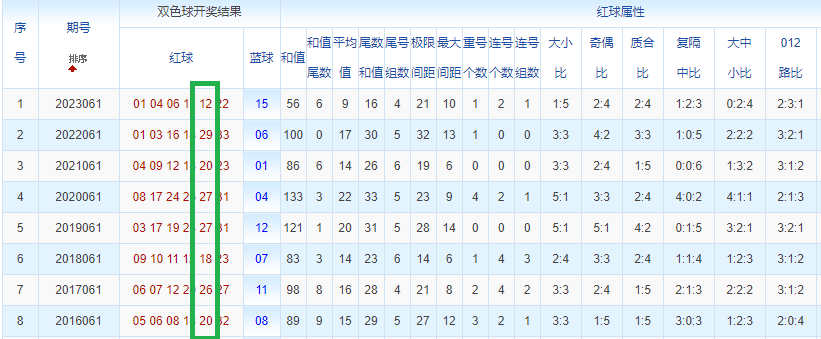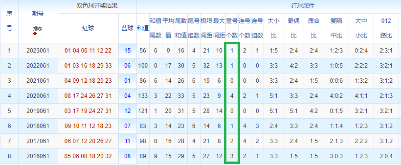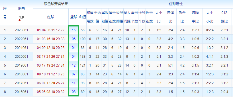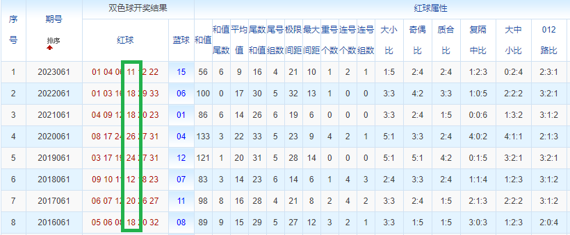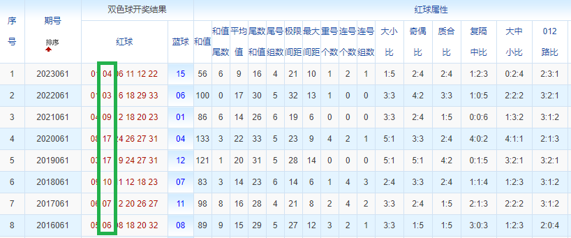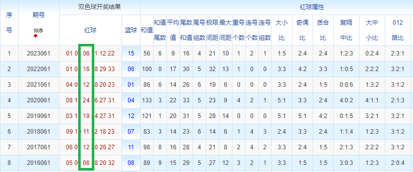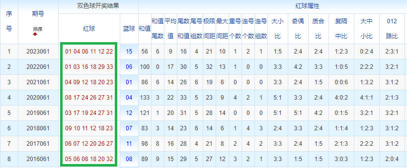 双色球玩法开奖多年,本人将从往年同期开奖号码来分析这期的开奖号数。比如研究2024061期,则把往年同期前八年的数据罗列出来分析,为什么是八?八是谐音发 发财的意思,这就是所谓的想有个好运气吧。