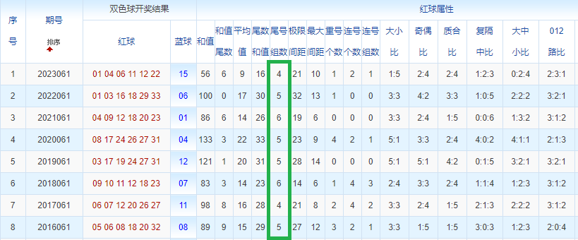 这八期开出的号码的尾号组数分别为:54655654。5组居多,则2024061期尾号组数选5组。