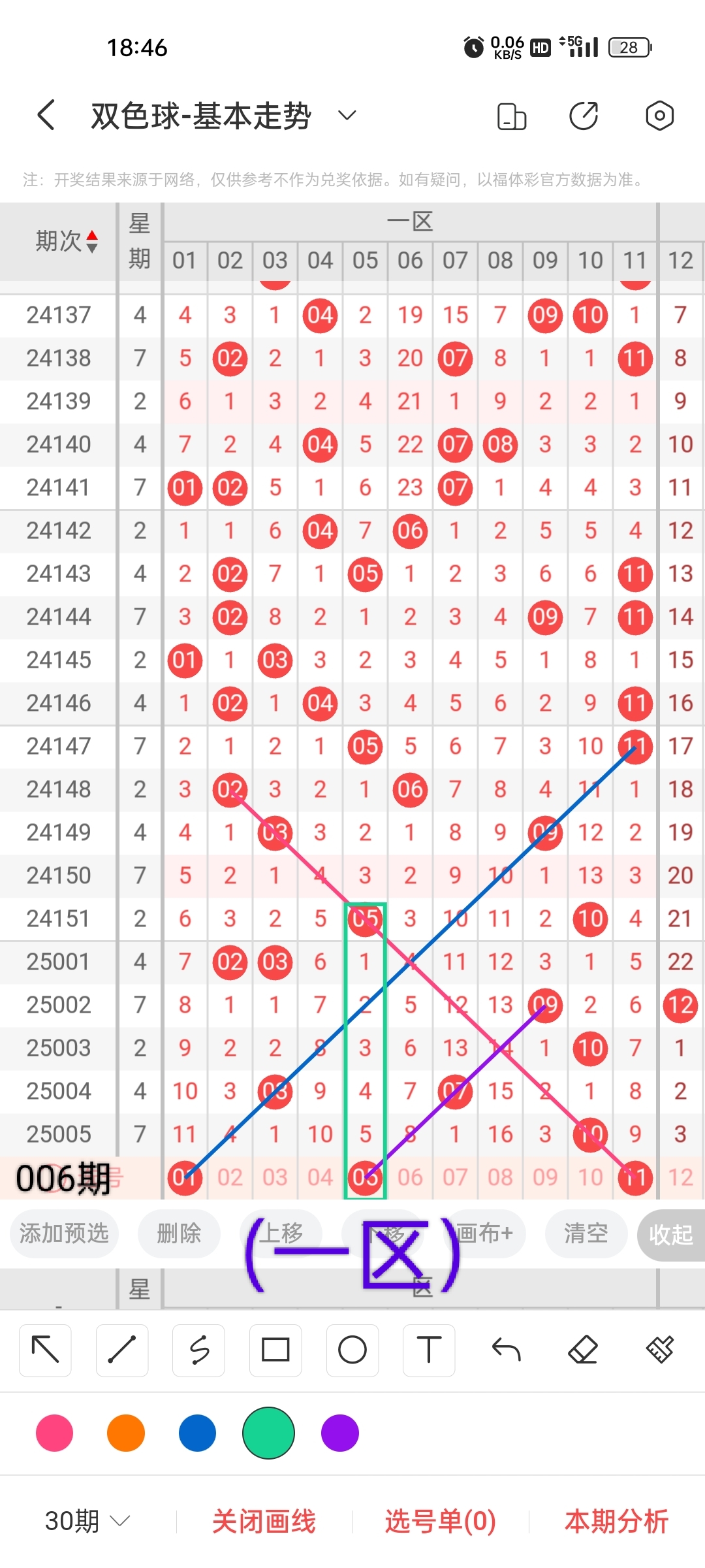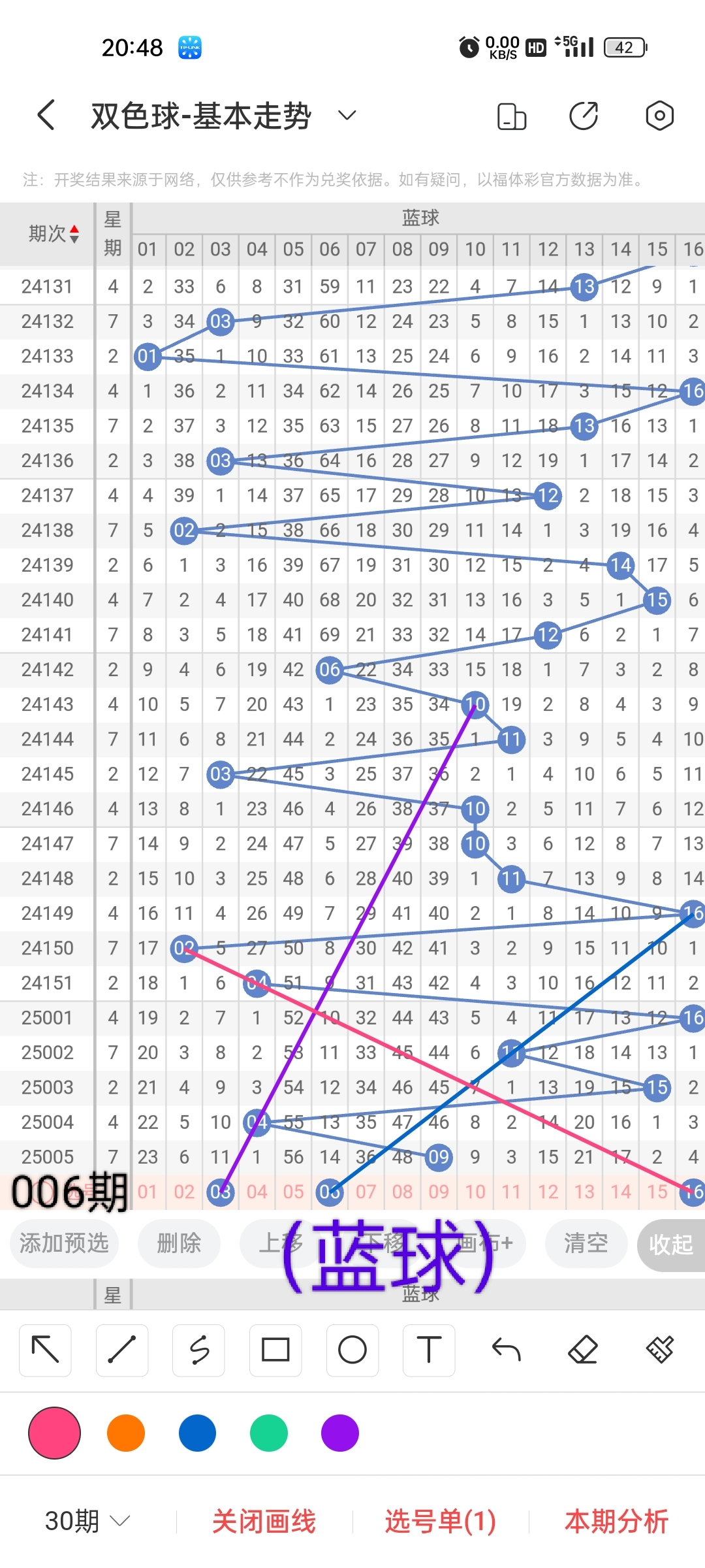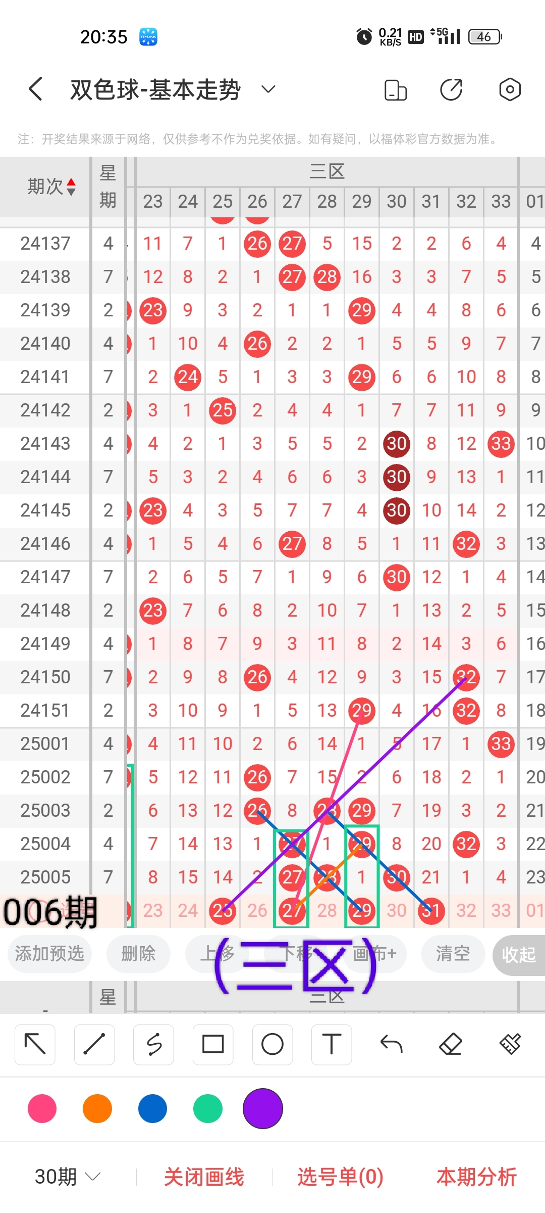 小梁根据图中画线思路,最后给大家汇总提供一下本期红球、蓝球数据,供大家参考: